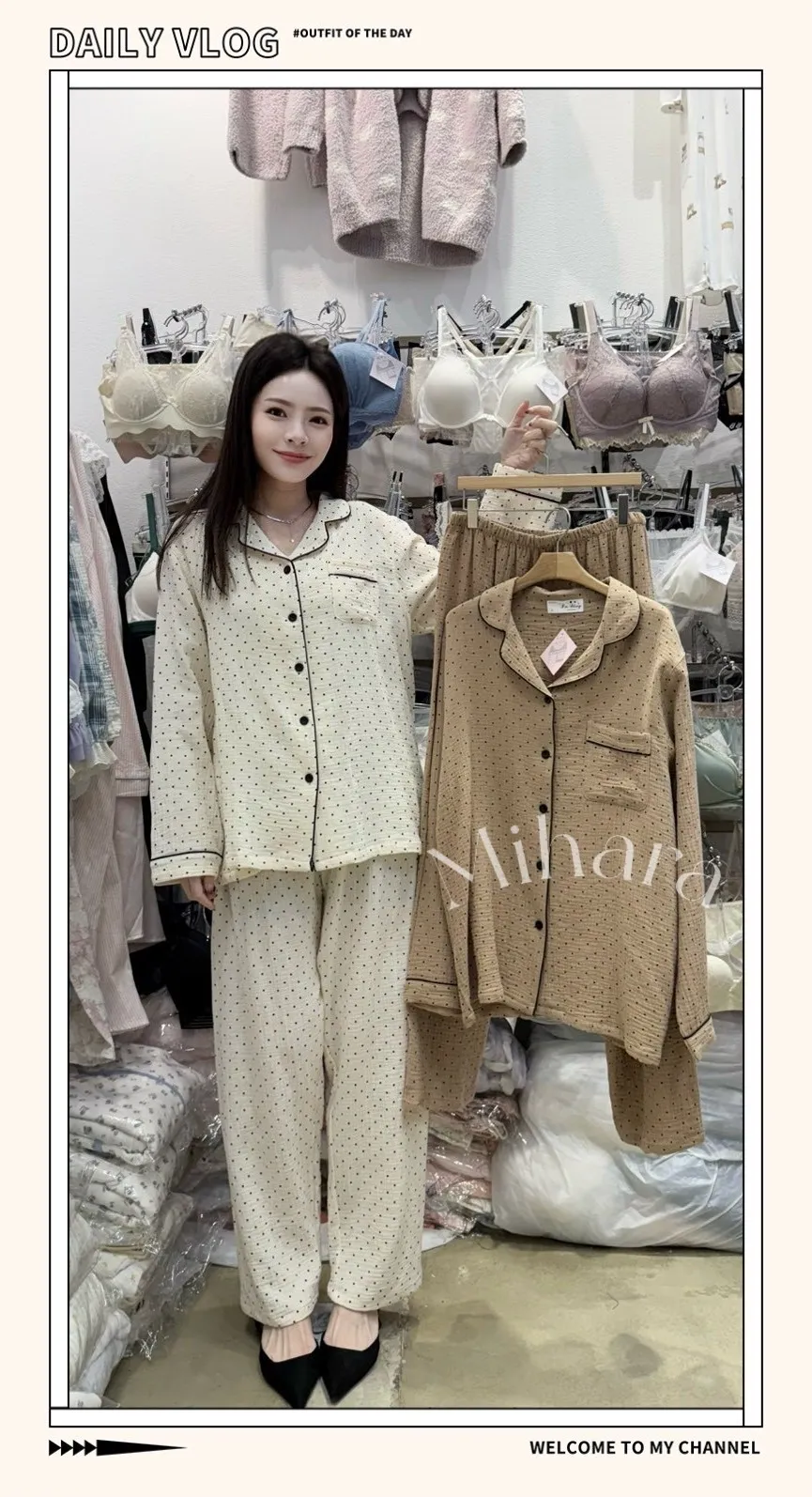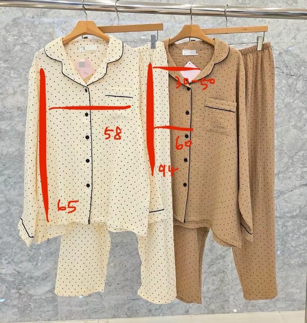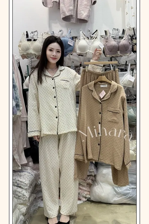 A43 1019甜美睡衣家點點排釦翻領V領純棉睡衣+睡褲(SET)