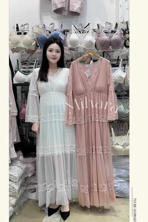 A45 1019甜美睡衣家簍空蕾絲V領蛋糕睡裙