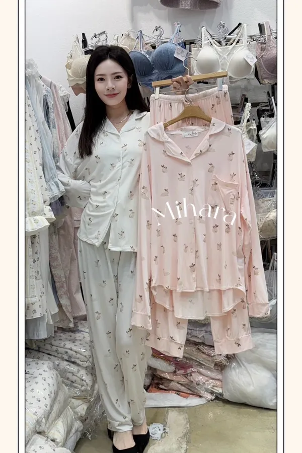 A46 1019甜美睡衣家兔兔排釦翻領V領睡衣+抽繩綁帶睡褲(SET)