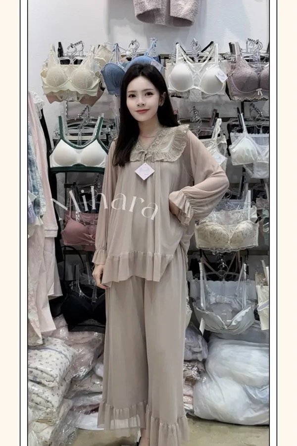 A54 1019甜美睡衣家拼接蕾絲V領睡衣+睡褲(SET)