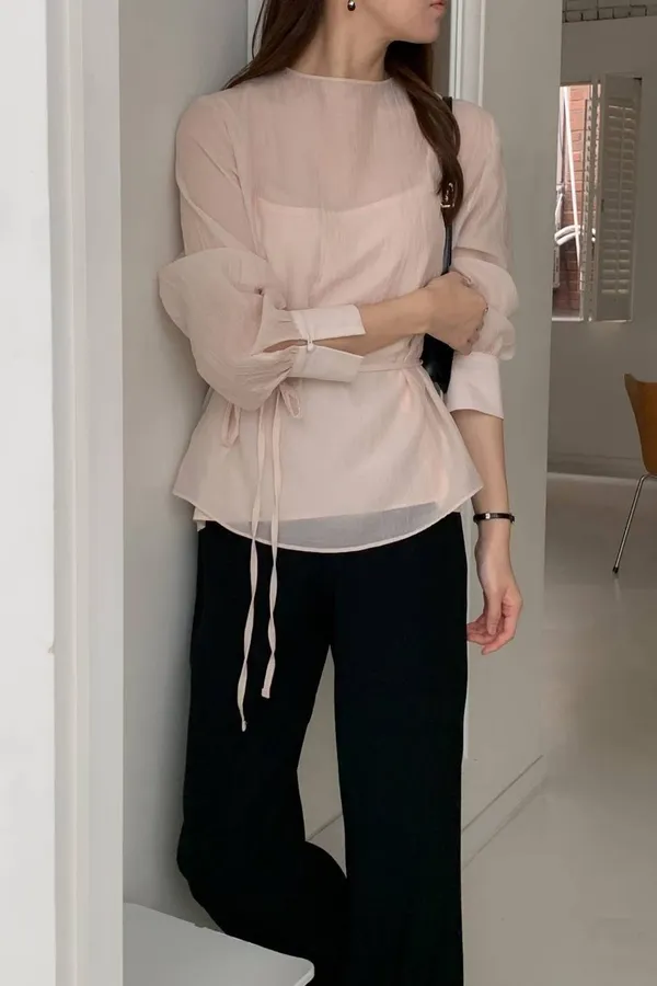 A58 1020外套家兩件式圓領透膚上衣+細肩帶背心附綁帶