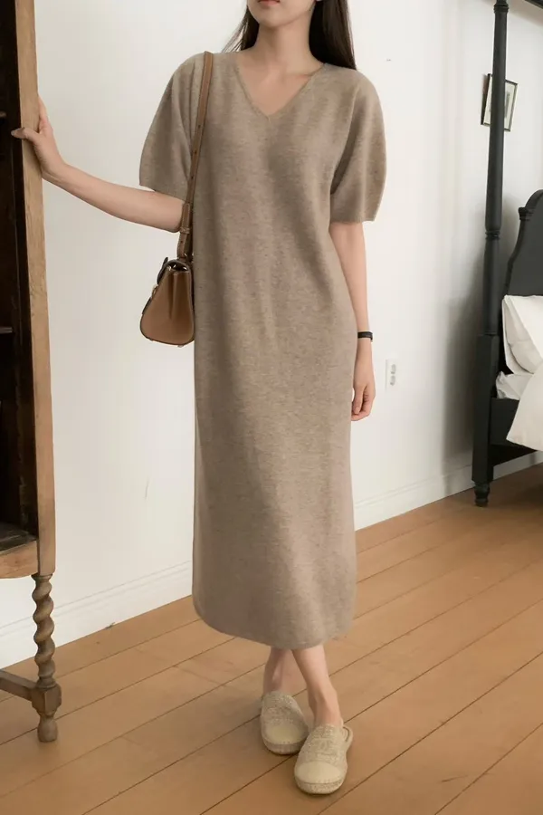 A71 1020針織家美麗諾羊毛混浣熊毛V領針織洋裝