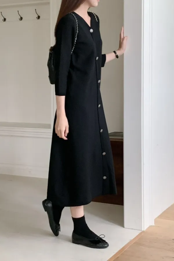 A73 1020針織家排釦V領高級人造絲85%針織洋裝