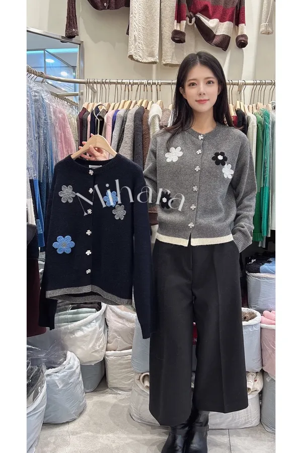 A16 1022Love針織家撞色下擺花花排釦圓領羊毛100%針織上衣