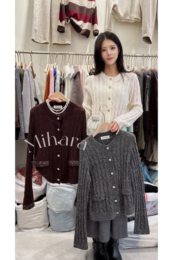 A29 1022Love針織家拼接亮片麻花編排釦圓領羊毛混羊絨針織上衣