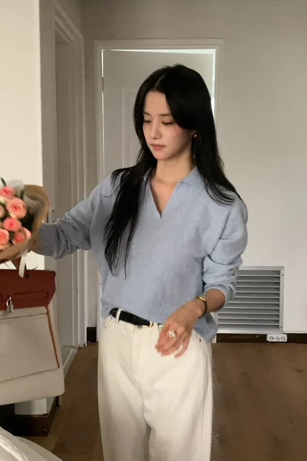 A7 1023高檔小香家翻領V領羊毛混羊絨針織上衣