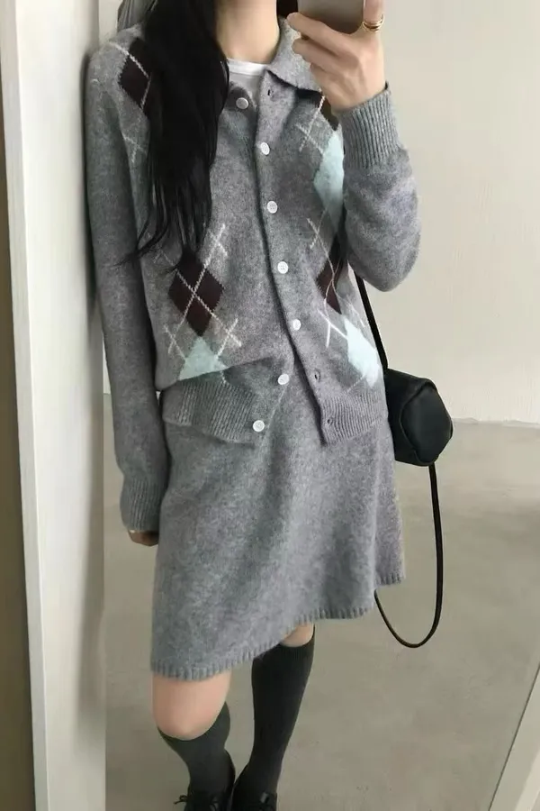 1026翻領菱格紋針織上衣外套+裙子(set)2色