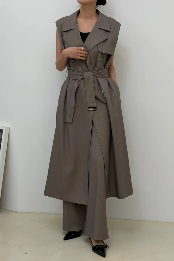 A1 1026高級翻領腰帶長版風衣背心+褲子3色(SET)