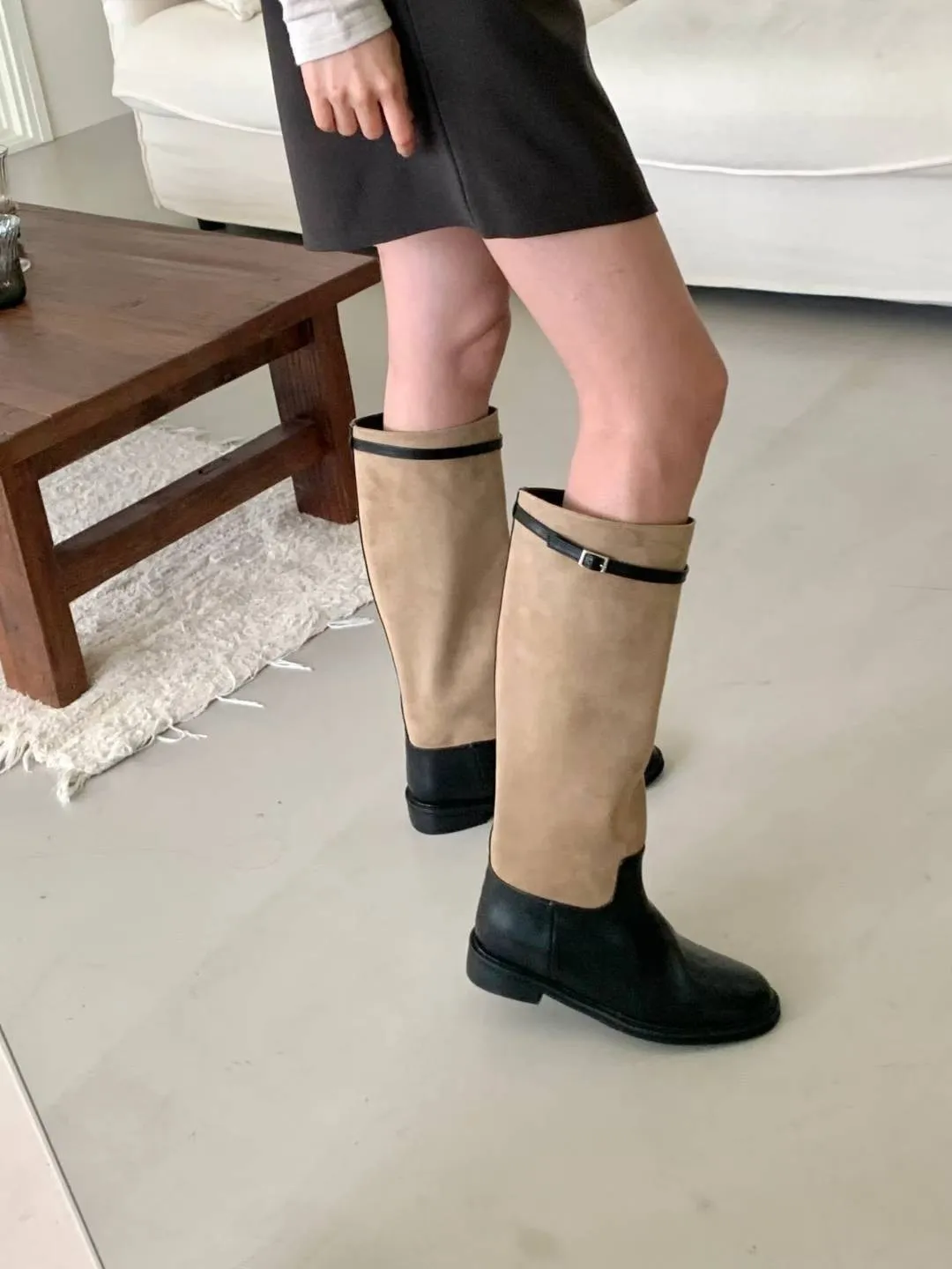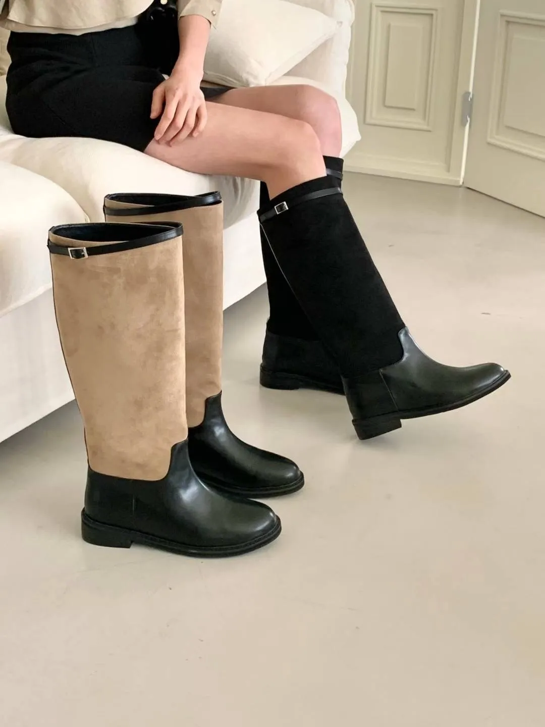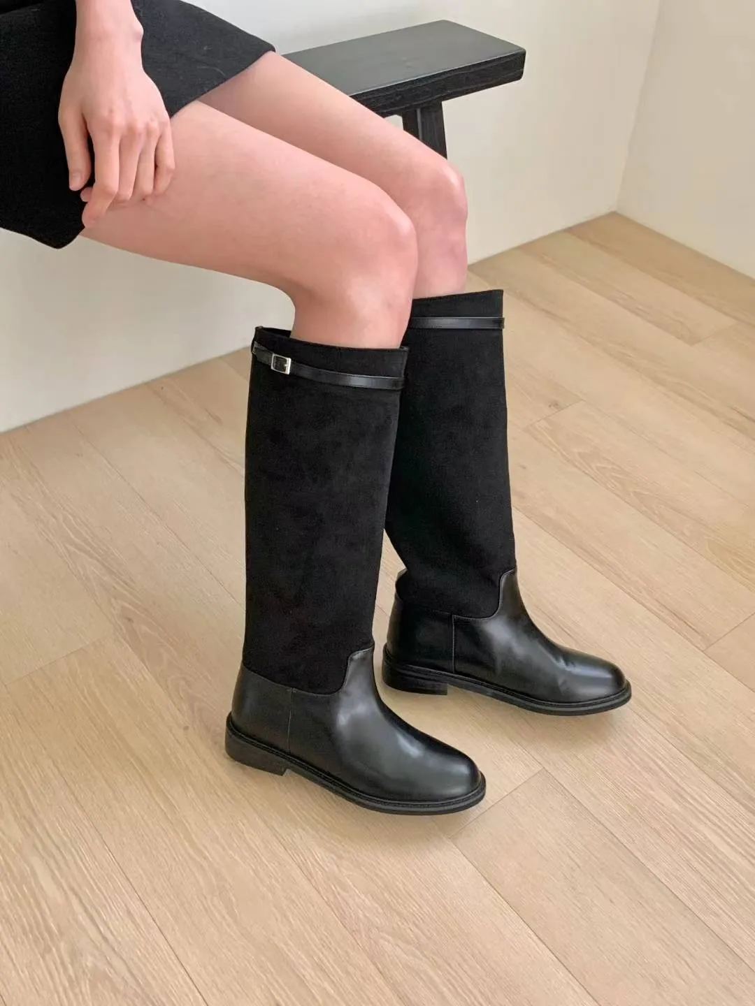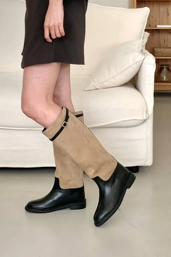 A6 1029拼接麂皮扣環圓頭高筒靴2色(230-250)7916