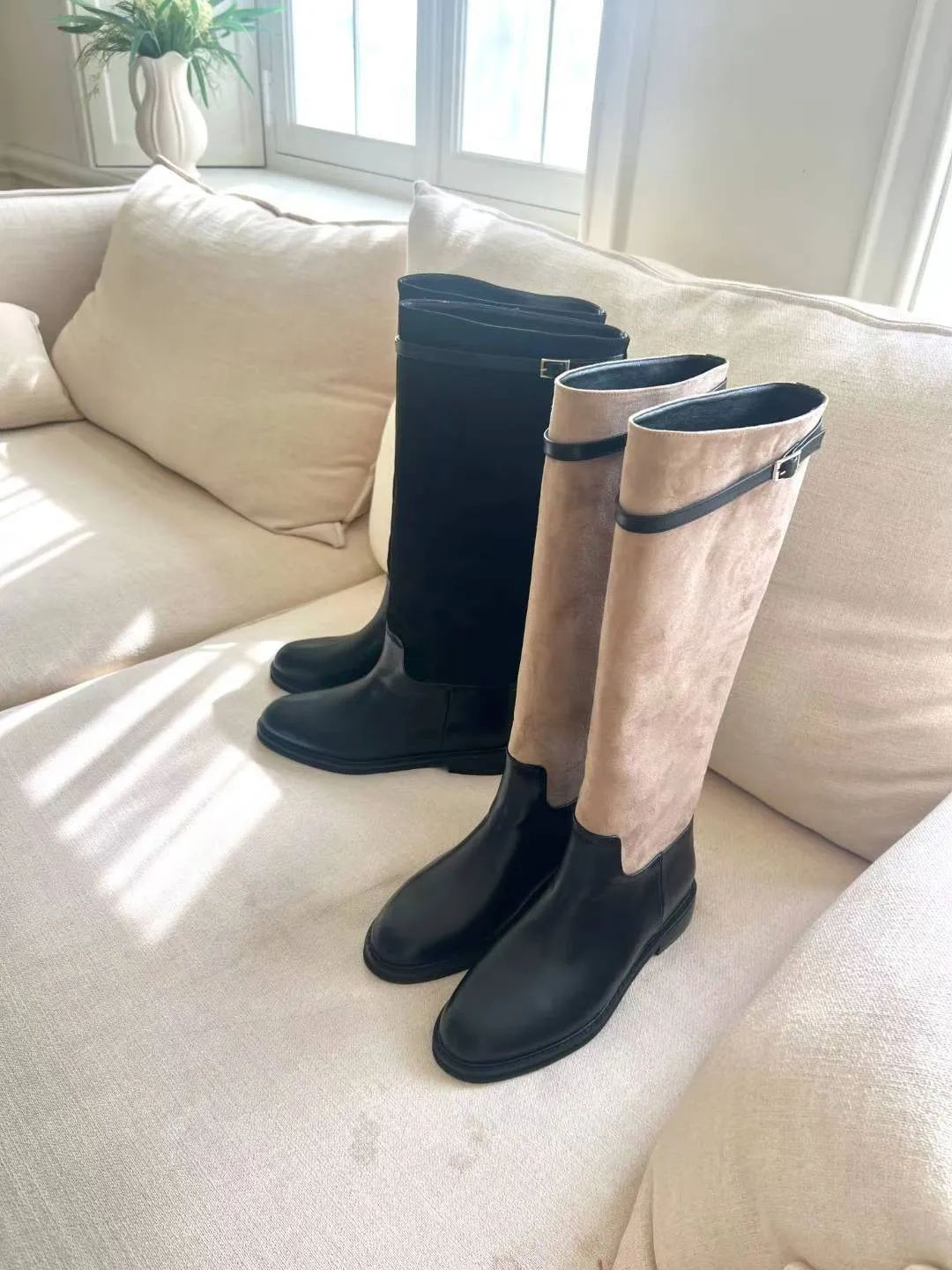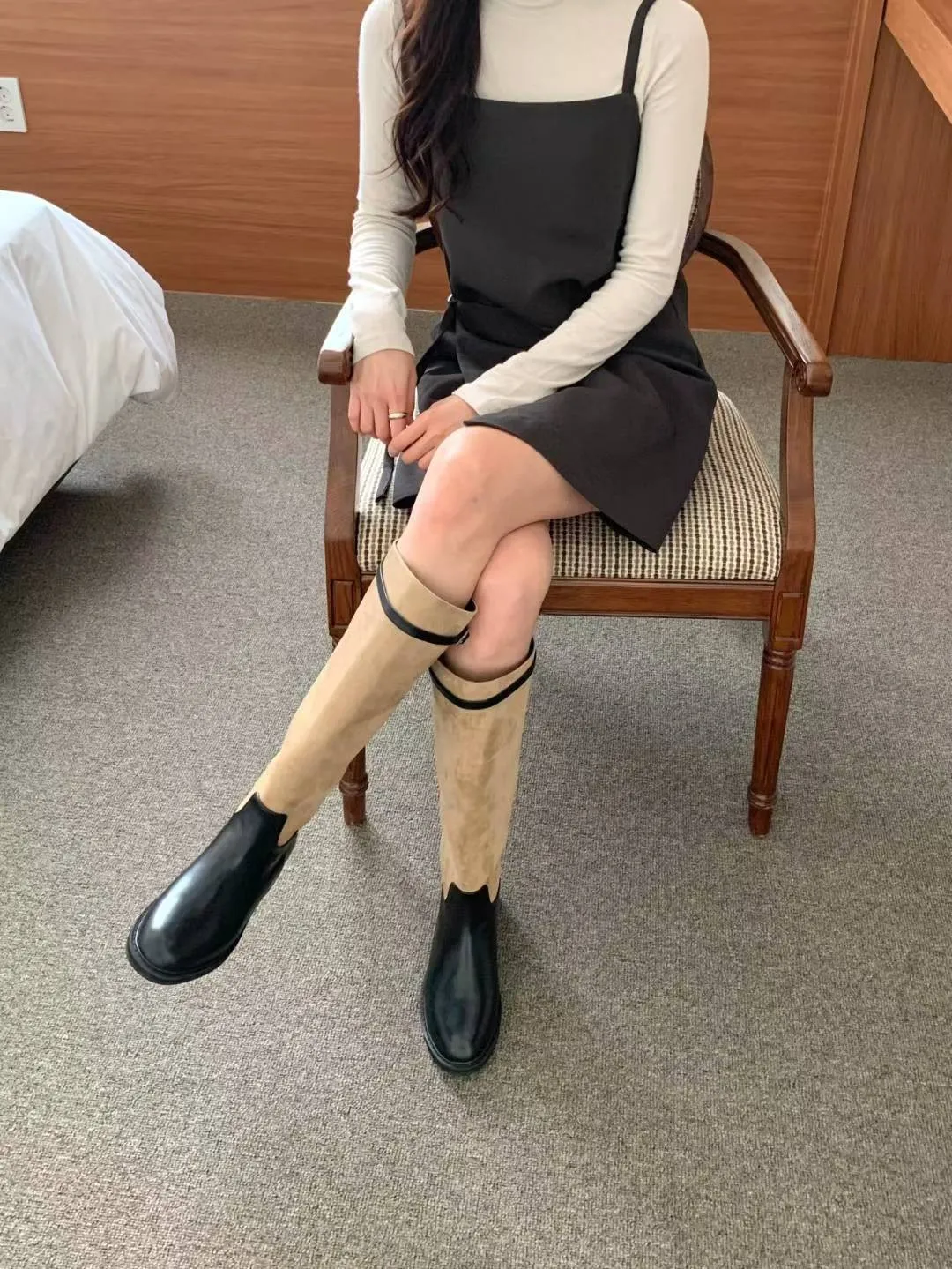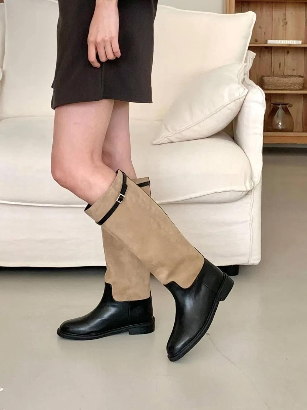 A6 1029拼接麂皮扣環圓頭高筒靴2色(230-250)7916