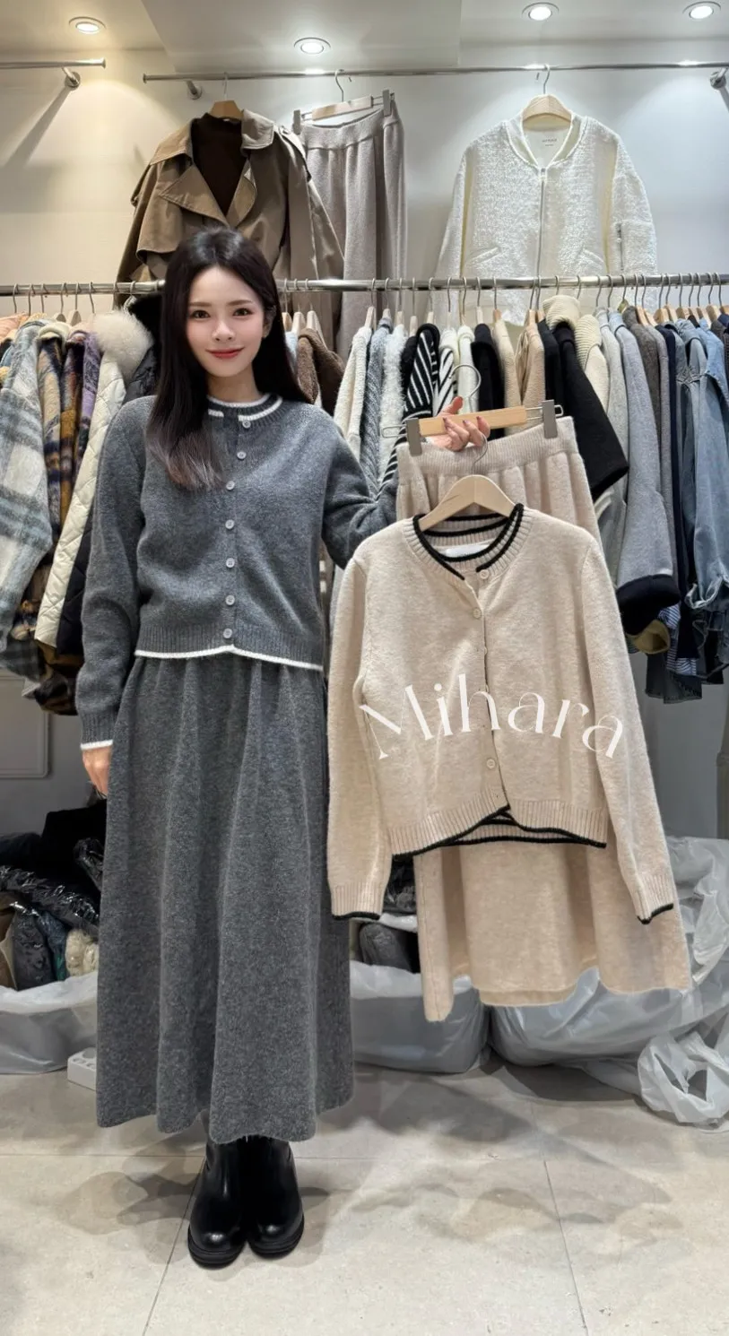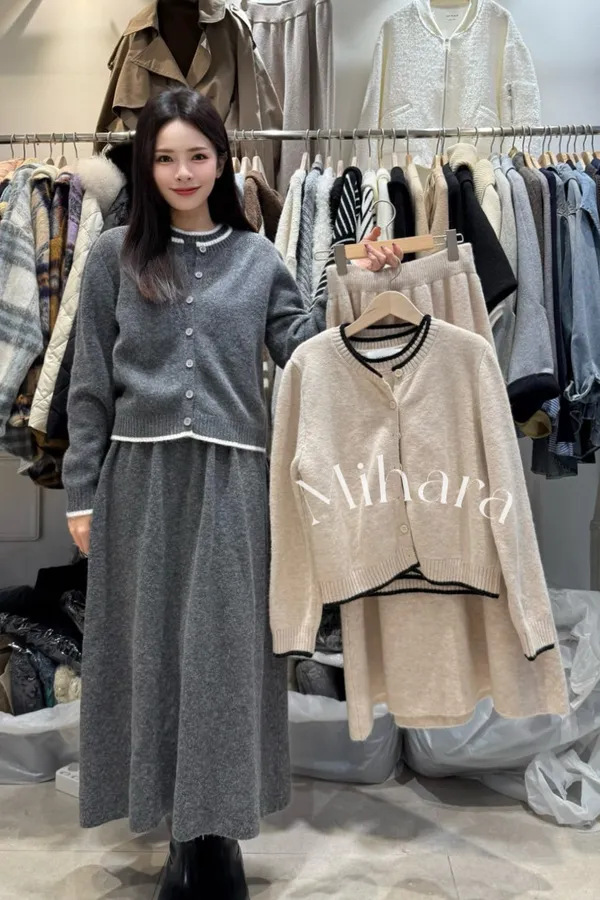 A44 1030外套家撞色滾邊排釦圓領針織罩衫+撞色滾邊圓領針織背心+針織半裙(SET)
