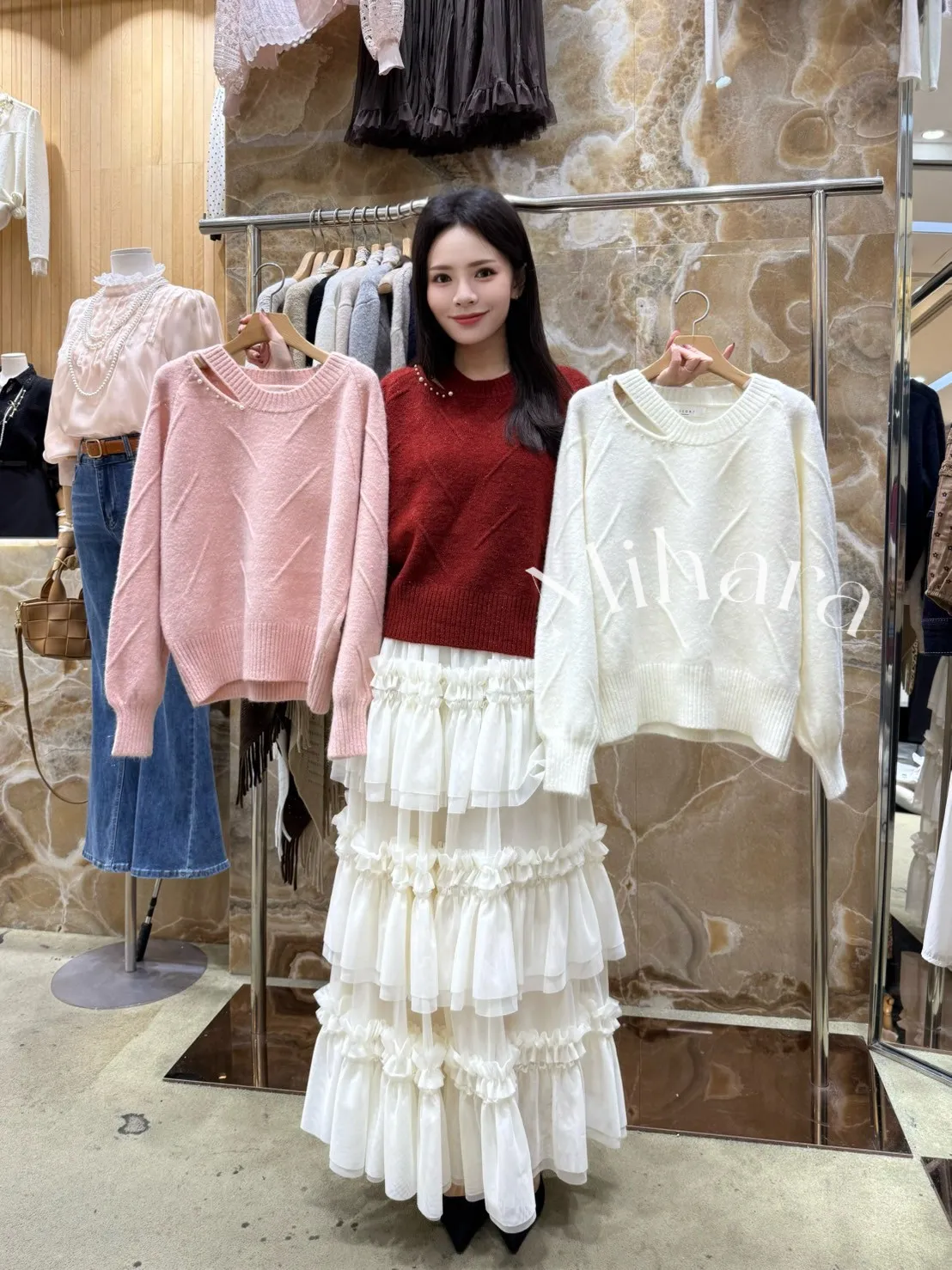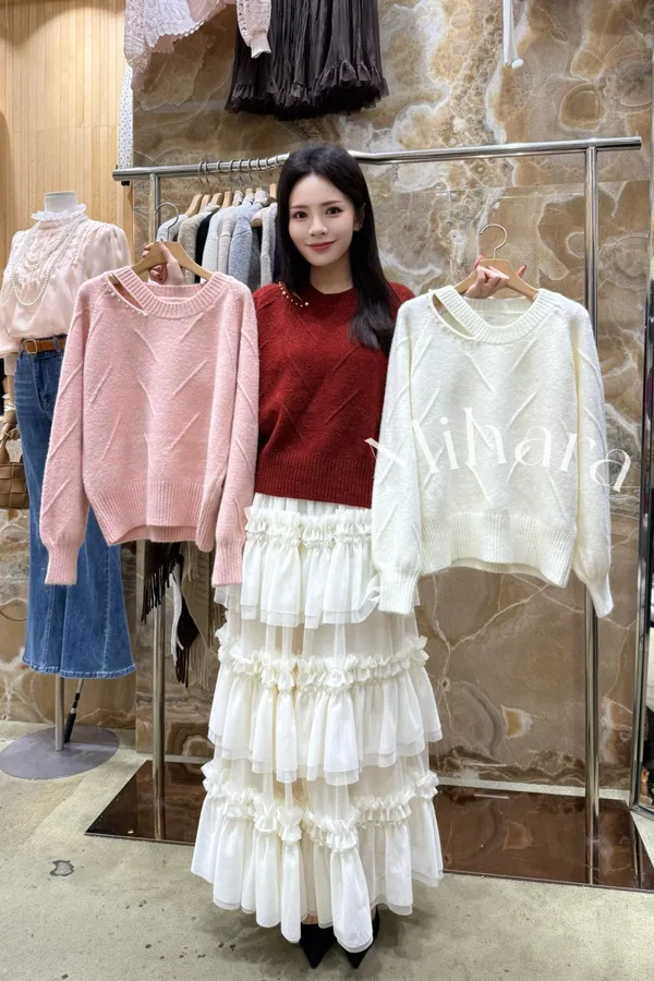 A60 1030優雅浪漫家拼接珍珠挖洞圓領毛衣
