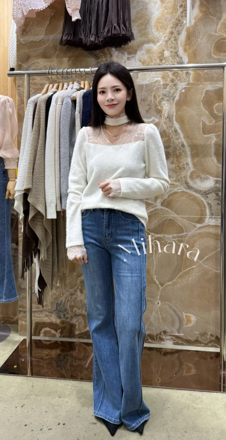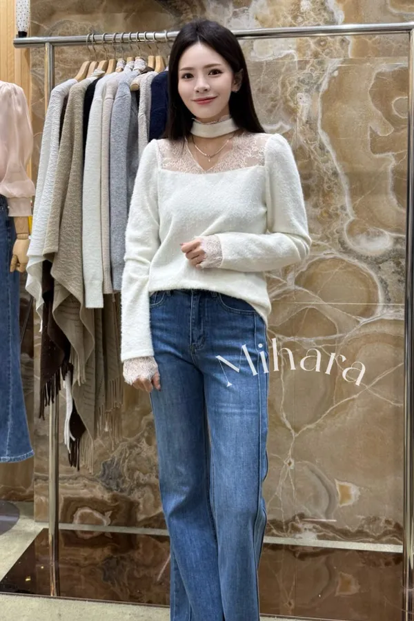 A64 1030優雅浪漫家拼接網紗睫毛蕾絲脖圍V領針織上衣