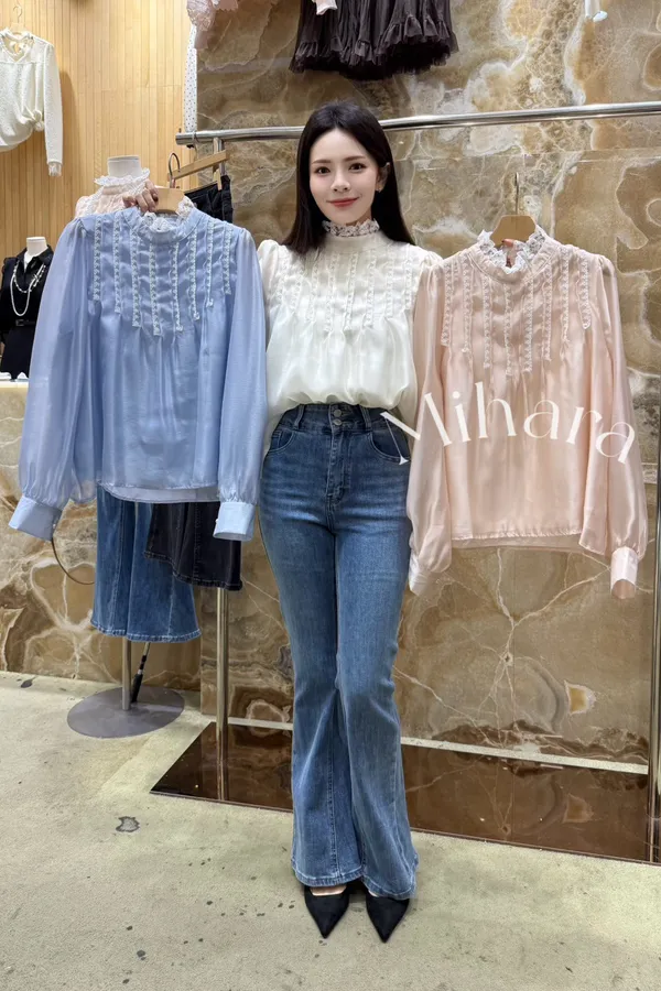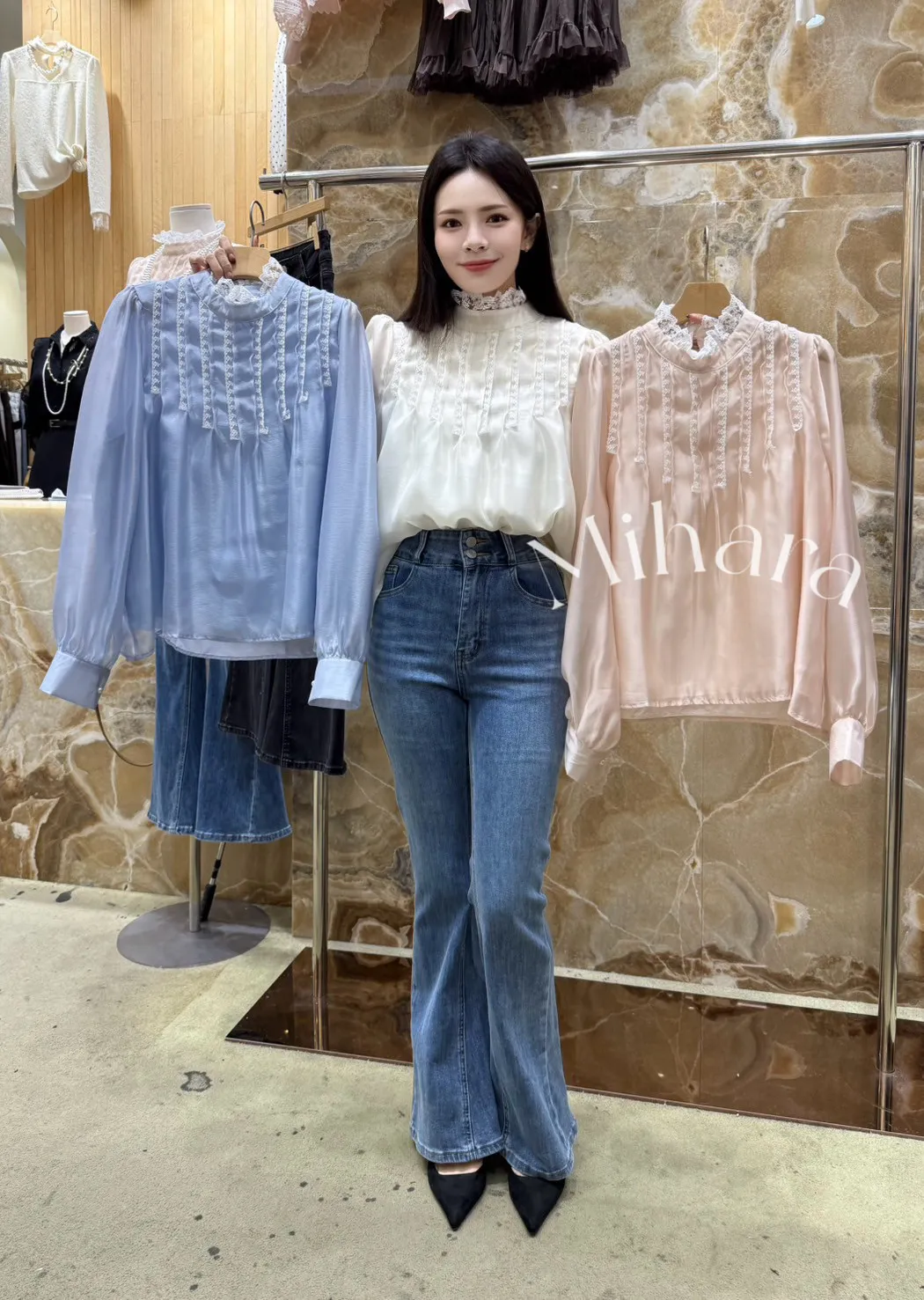 A73 1030優雅浪漫家拼接布蕾絲半領雪紡上衣