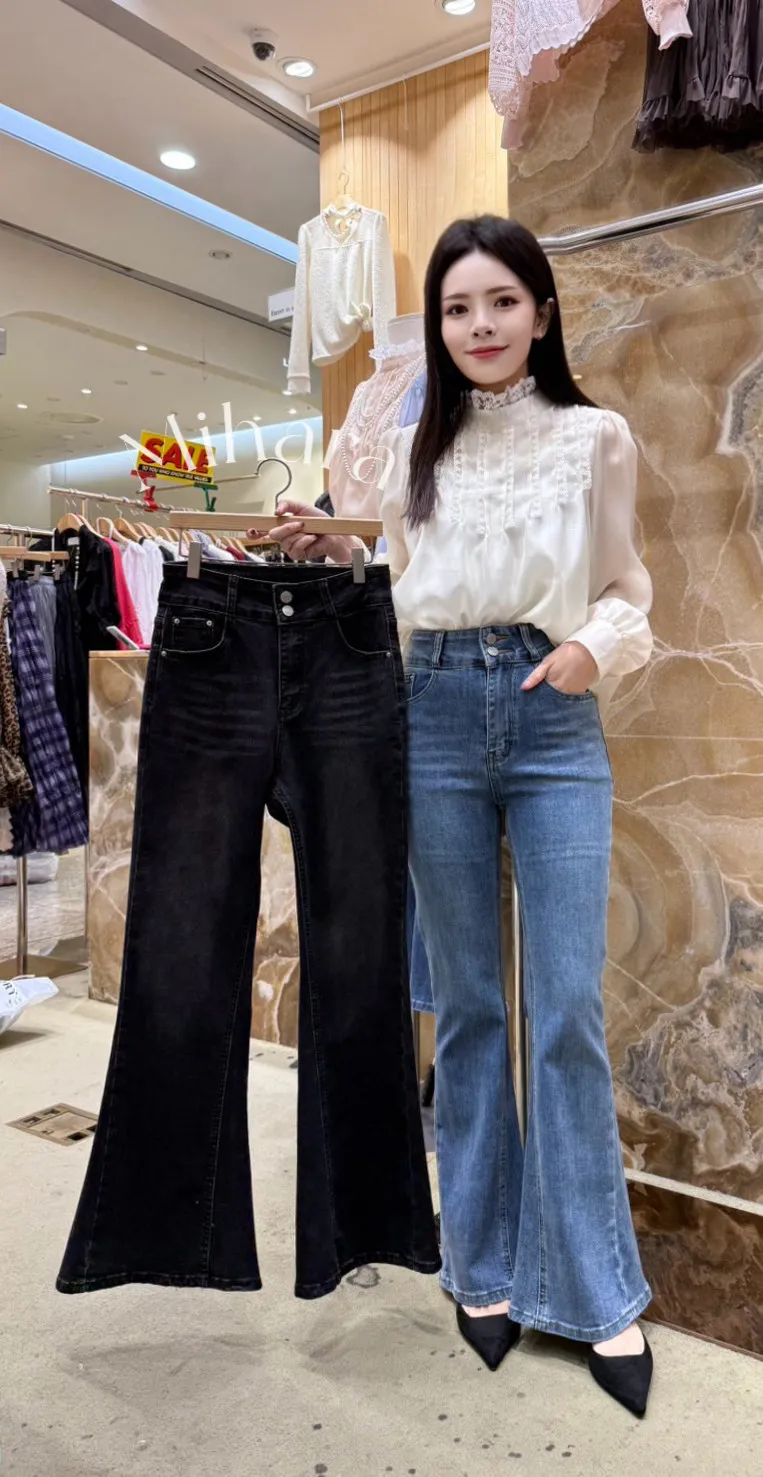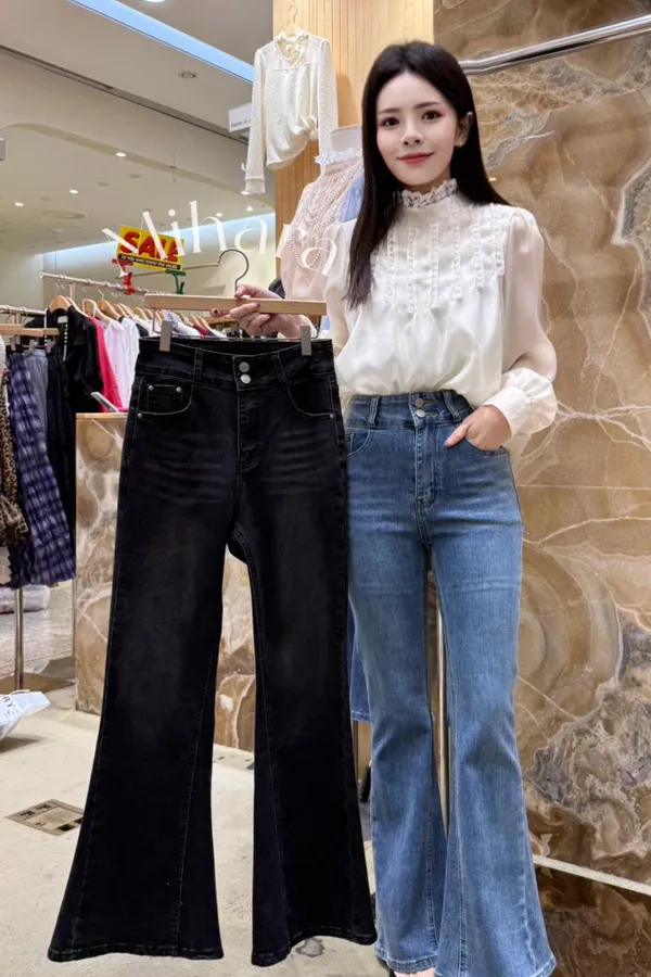 A74 1030優雅浪漫家雙釦高腰喇叭牛仔褲(S/M/L)