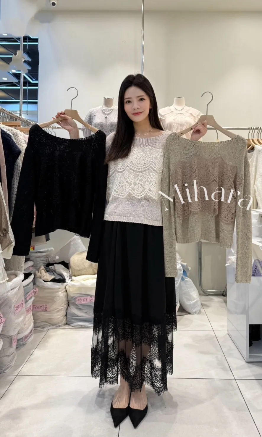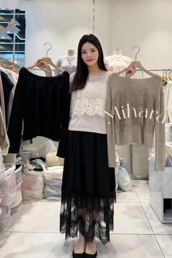 A1 1102拼接睫毛蕾絲圓領針織上衣