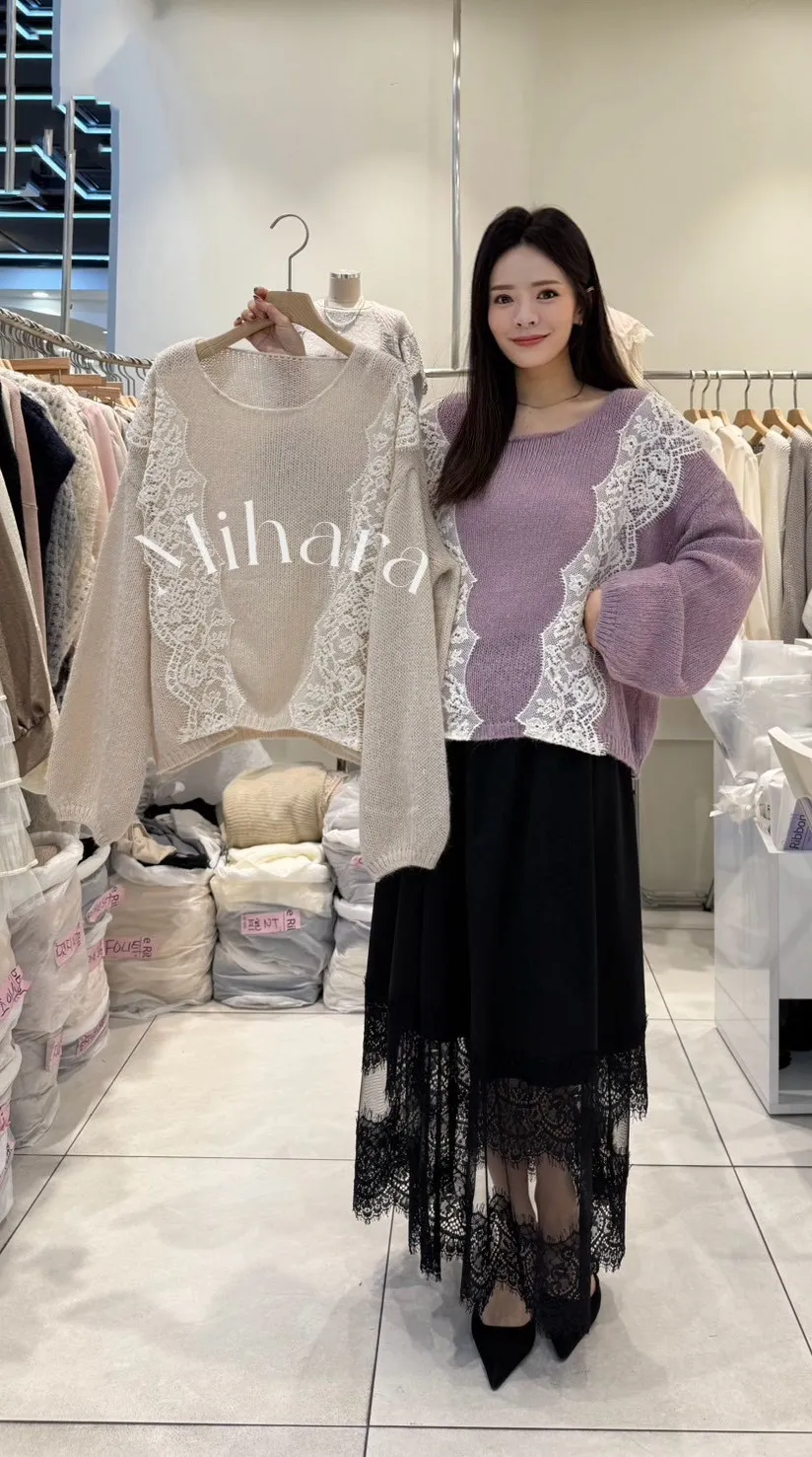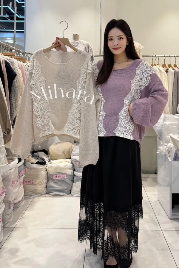 A2 1102兩側拼接睫毛蕾絲圓領針織上衣