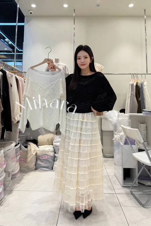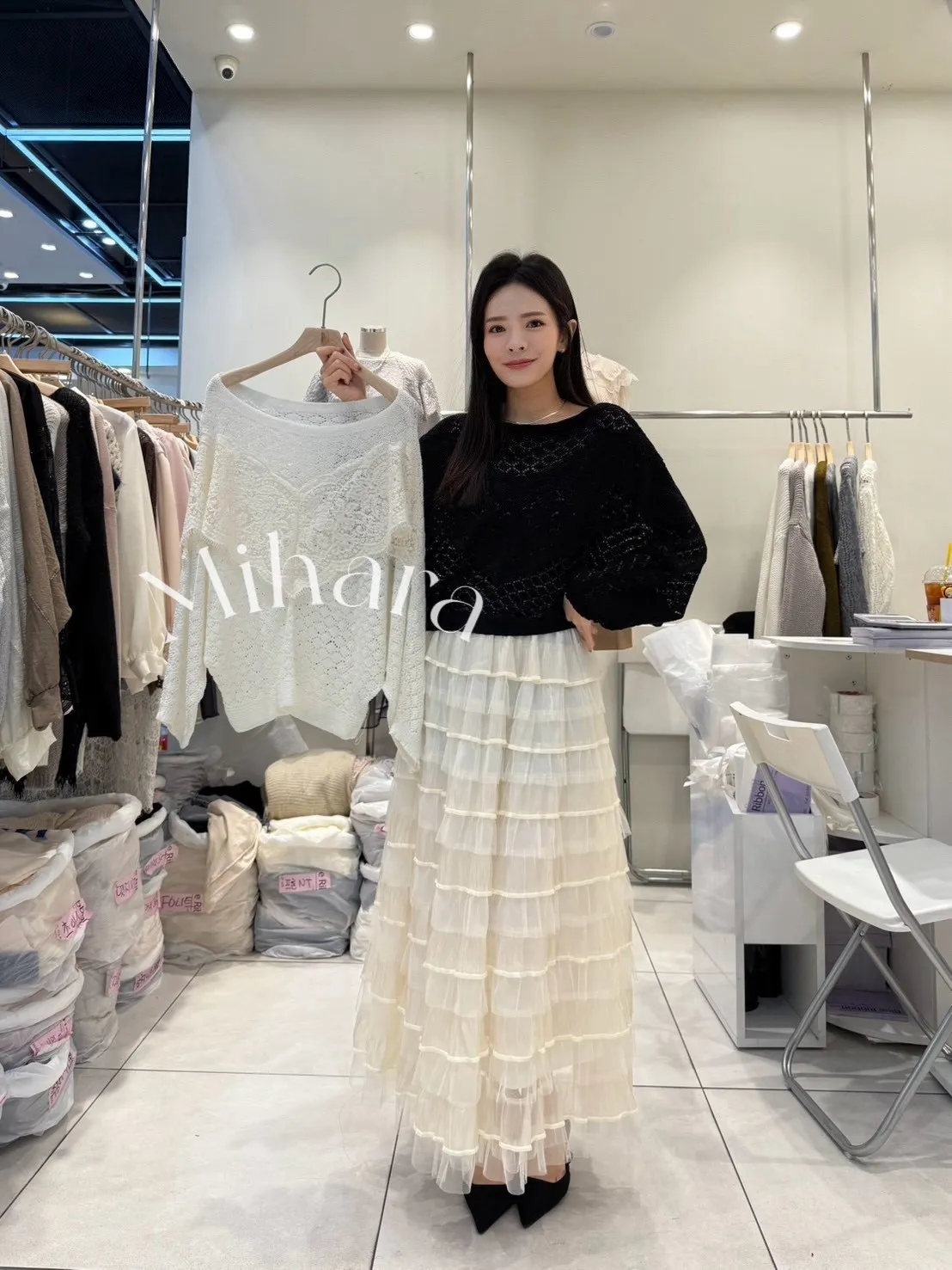 A9 1102拼接睫毛蕾絲簍空菱格帆船領針織上衣