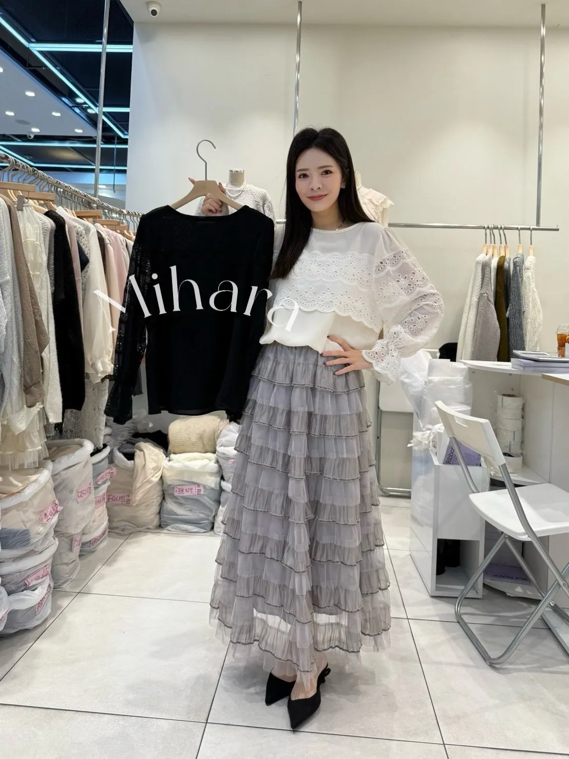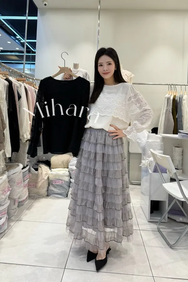 A10 1102拼接燒花布蕾絲圓領雪紡上衣