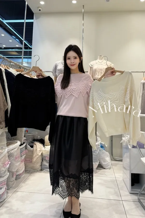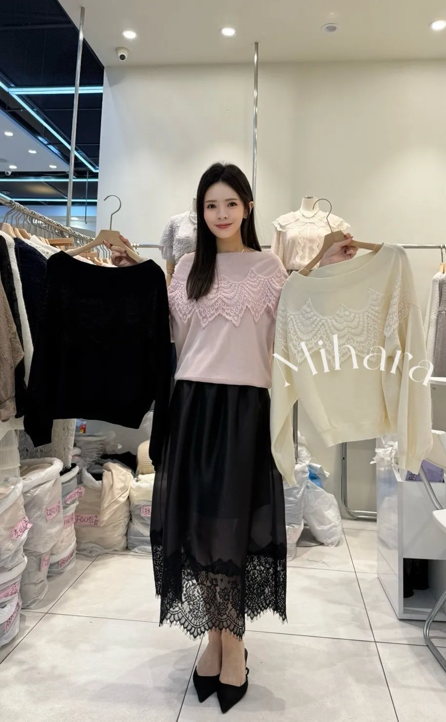 A12 1102拼接睫毛蕾絲帆船領可拉一字領針織上衣