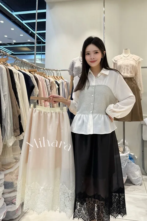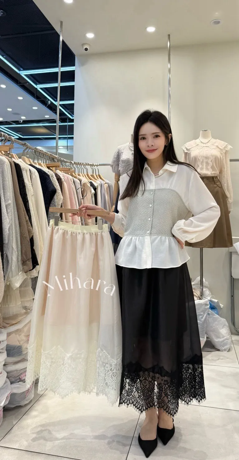 A14 1102拼接睫毛蕾絲下擺雪紡半裙