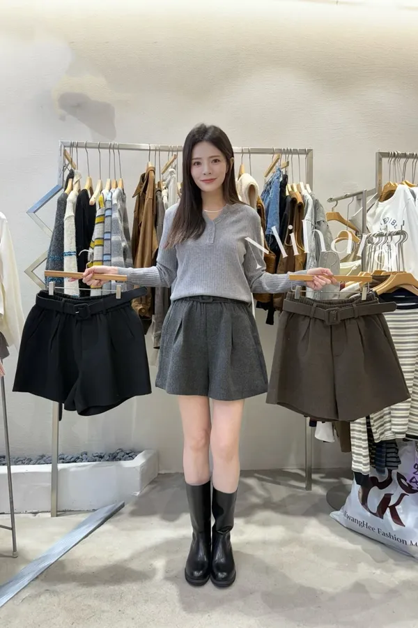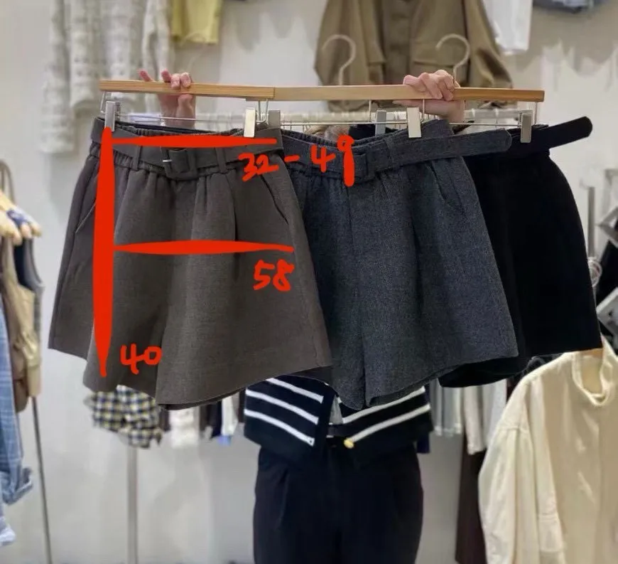 A24 1102立體壓褶A字毛呢短褲附腰帶