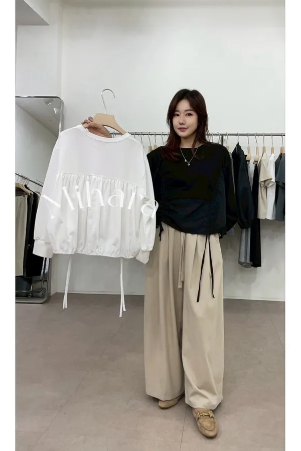 A18 1103錢錢歐膩家側抽繩綁帶拼接雪紡圓領純棉上衣