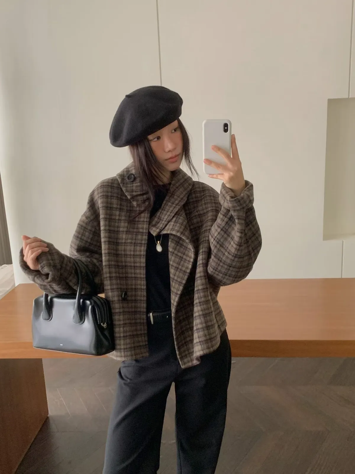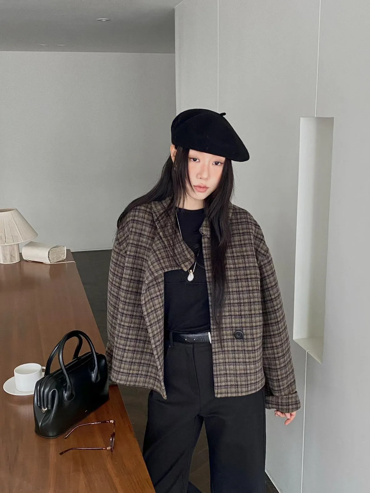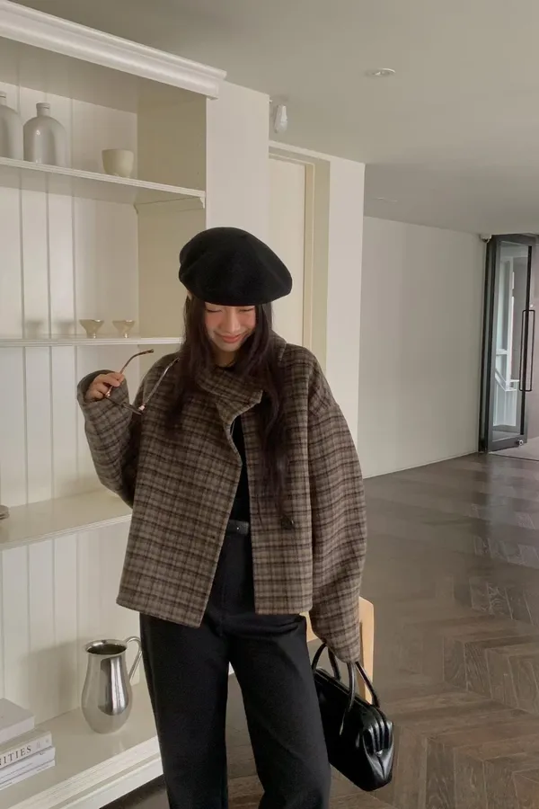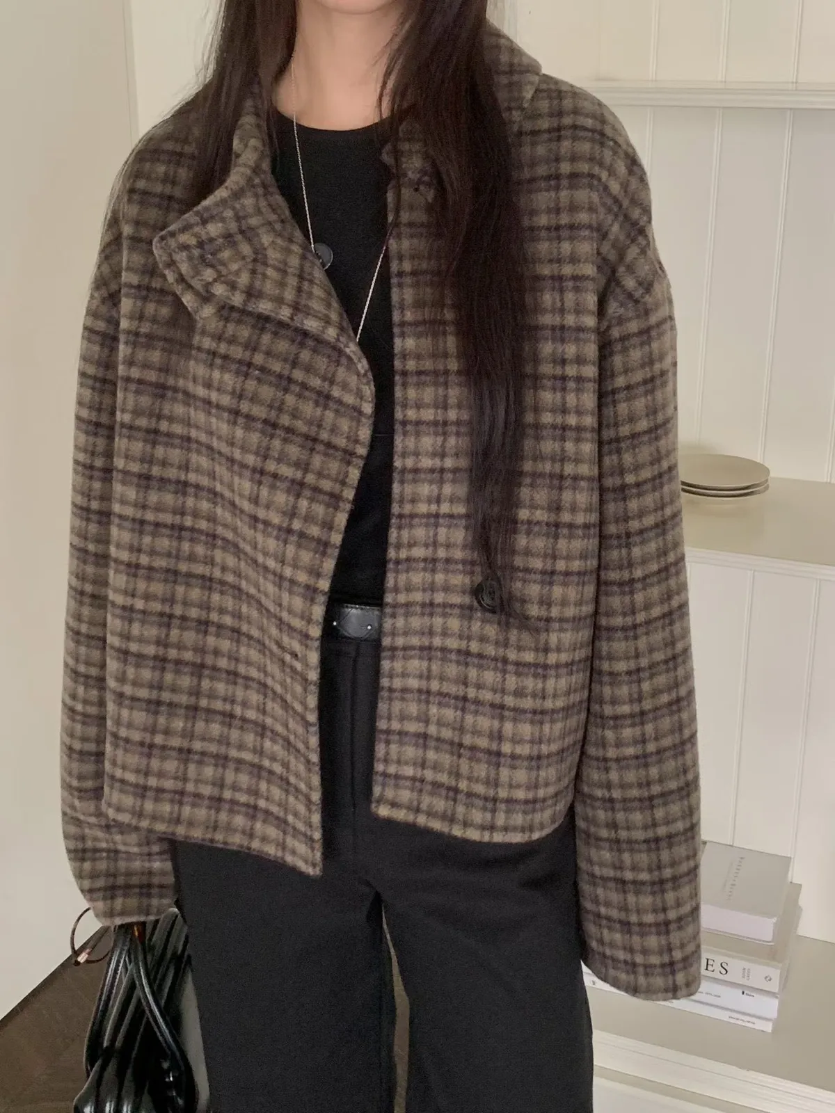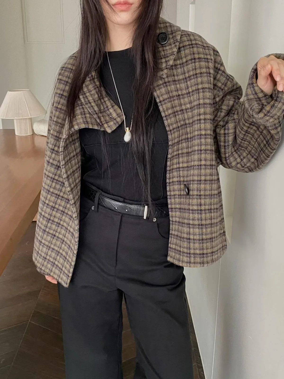 C34字母家翻領格紋羊毛外套