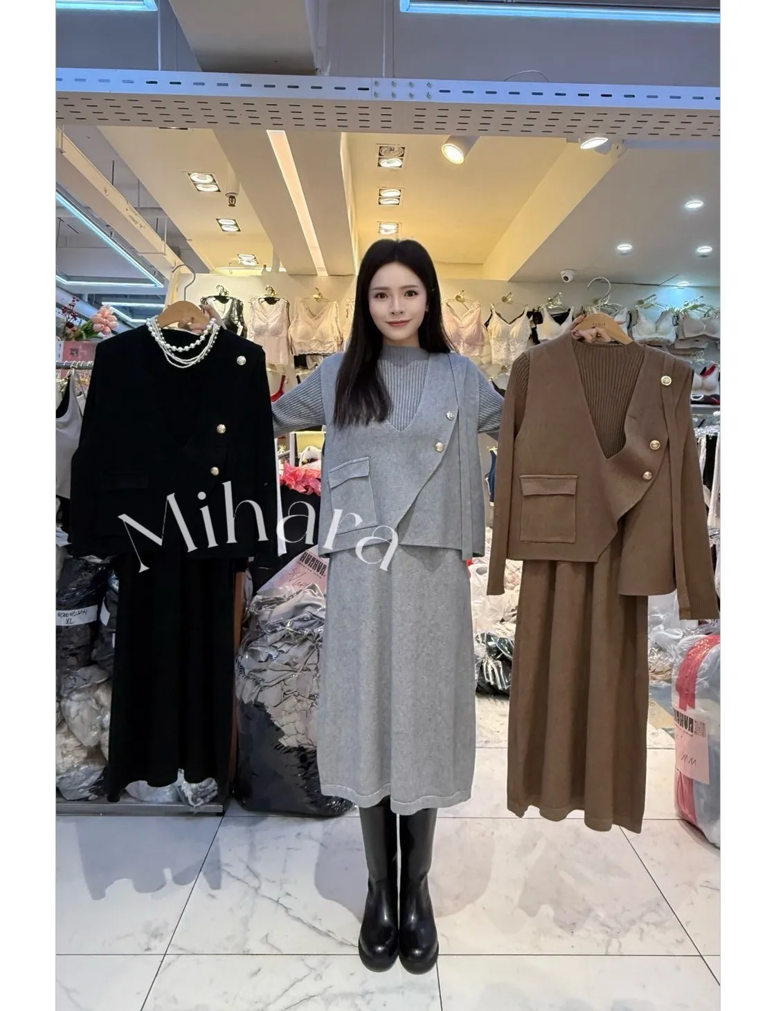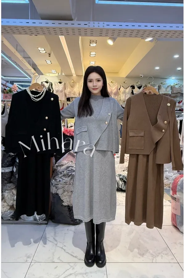 A27 1104甜美蕾絲家側排釦開衩V領針織背心+圓領針織洋裝(SET)