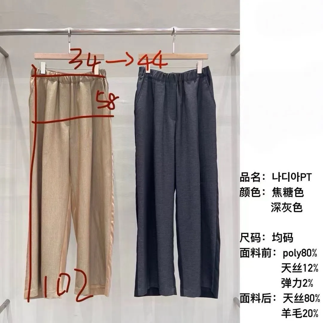 | 腰34-44臀58褲長102cm(已上尺寸為<單面平量/CM>) | 前聚脂纖維80%、天絲12%、彈力2%,後天絲80%、羊毛20%,前鬆緊,側拉鍊、口袋 | Model:東海160cm/45kg |