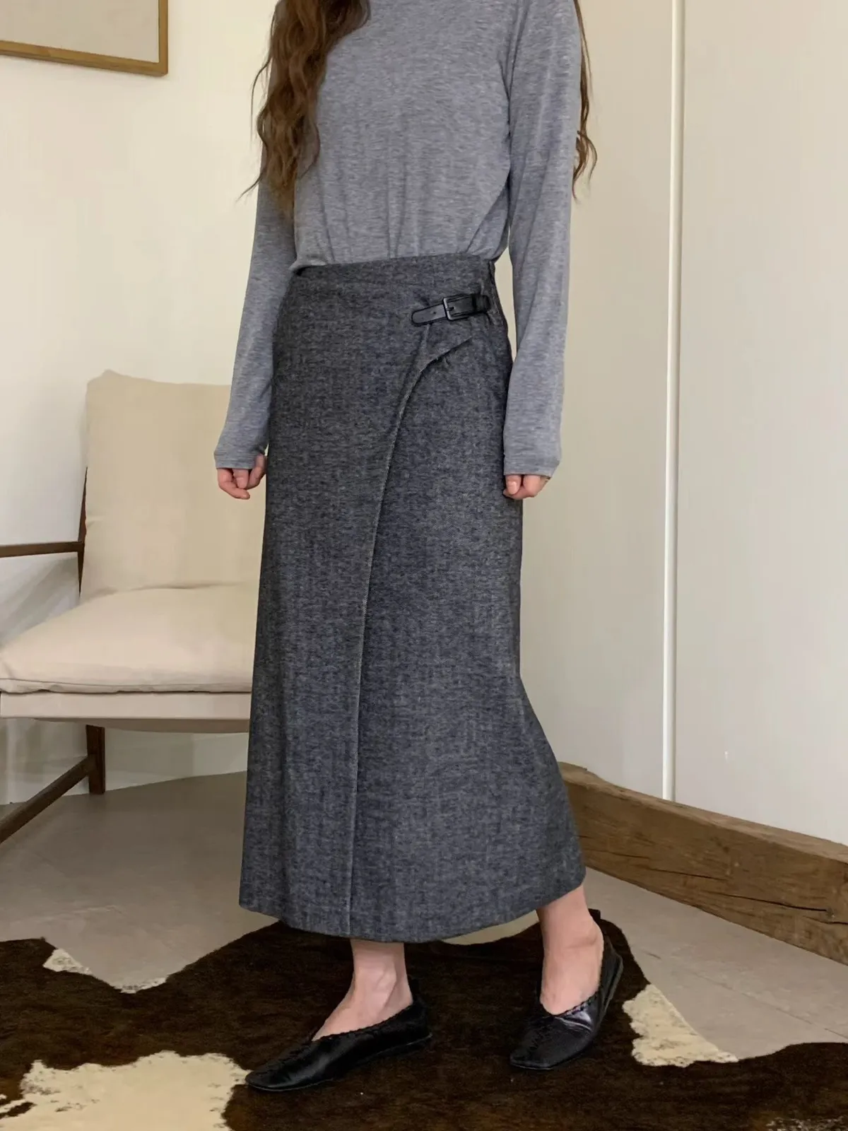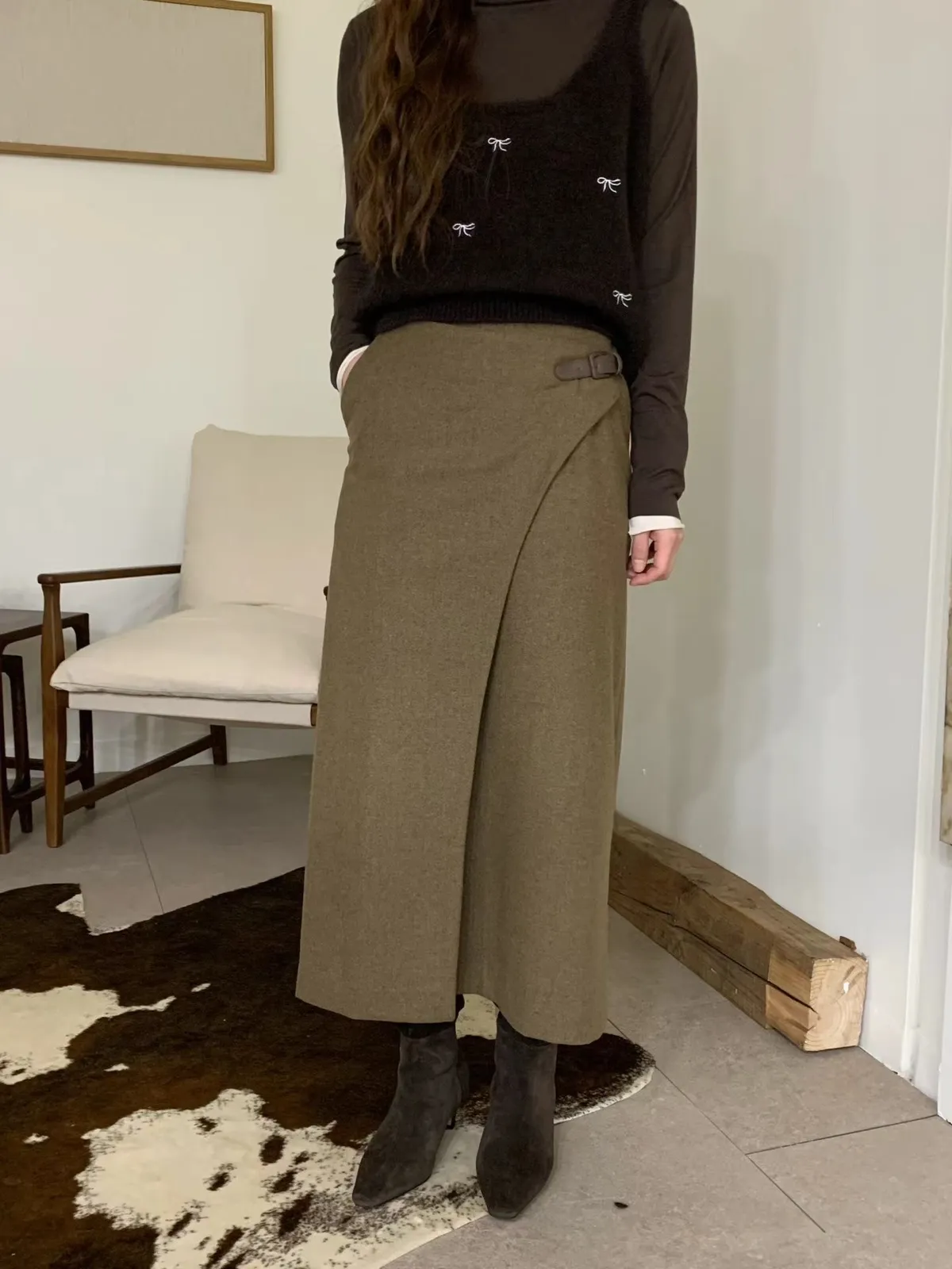 A52 1104氣質歐膩家後開衩拼接皮帶斜擺羊毛37%針織半裙