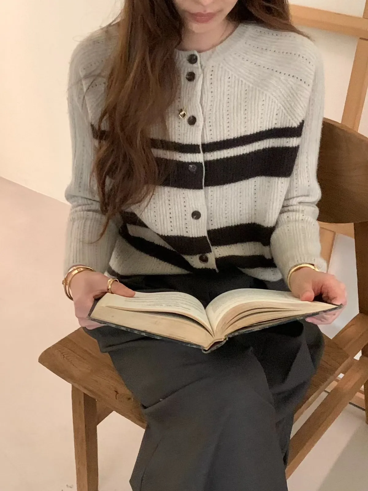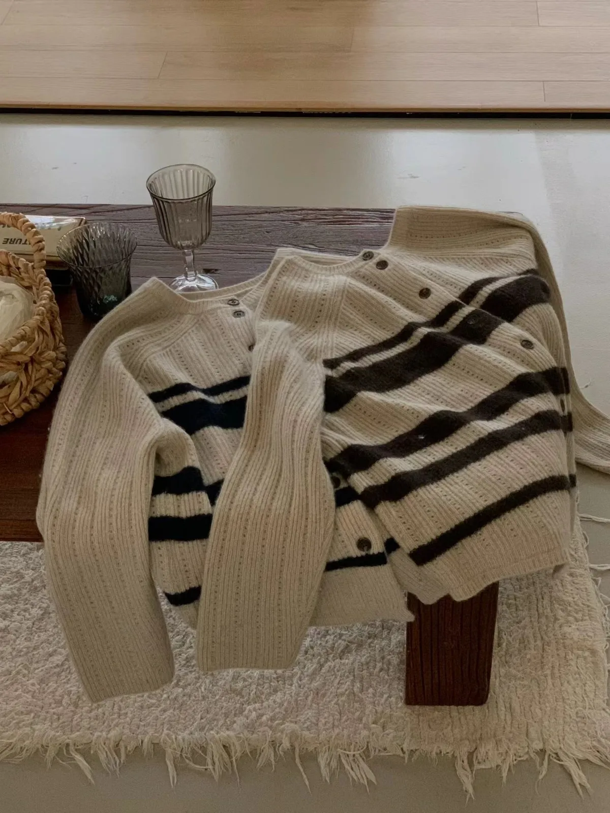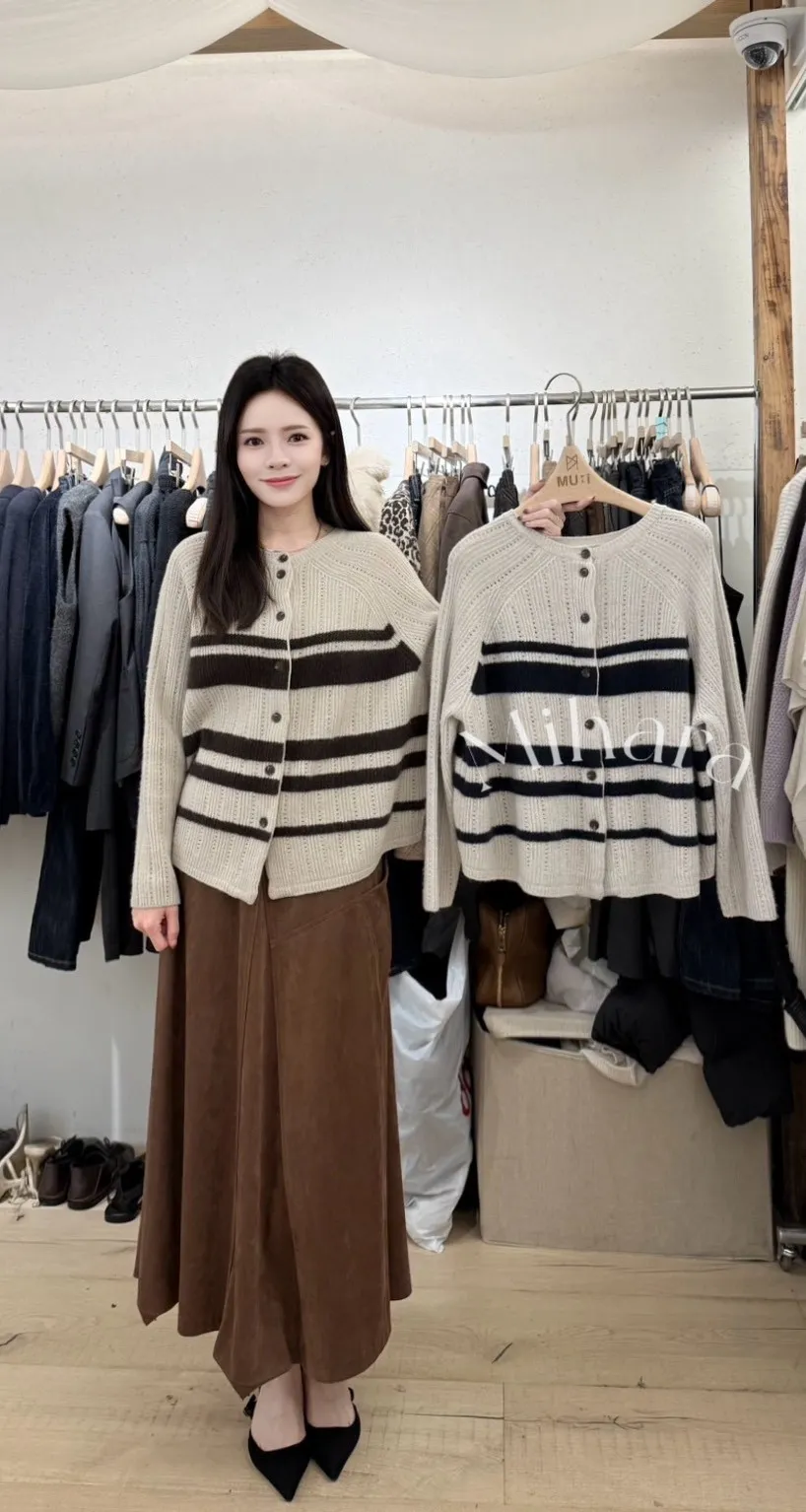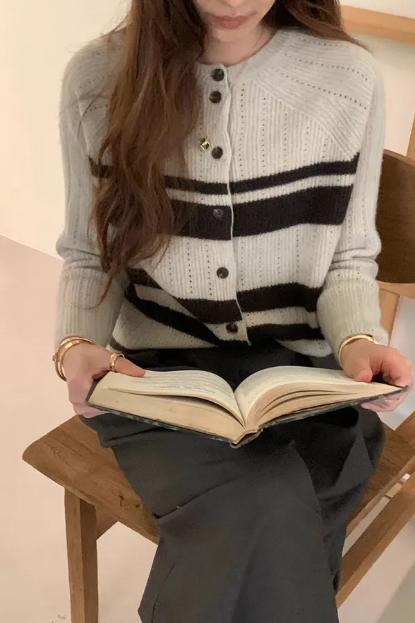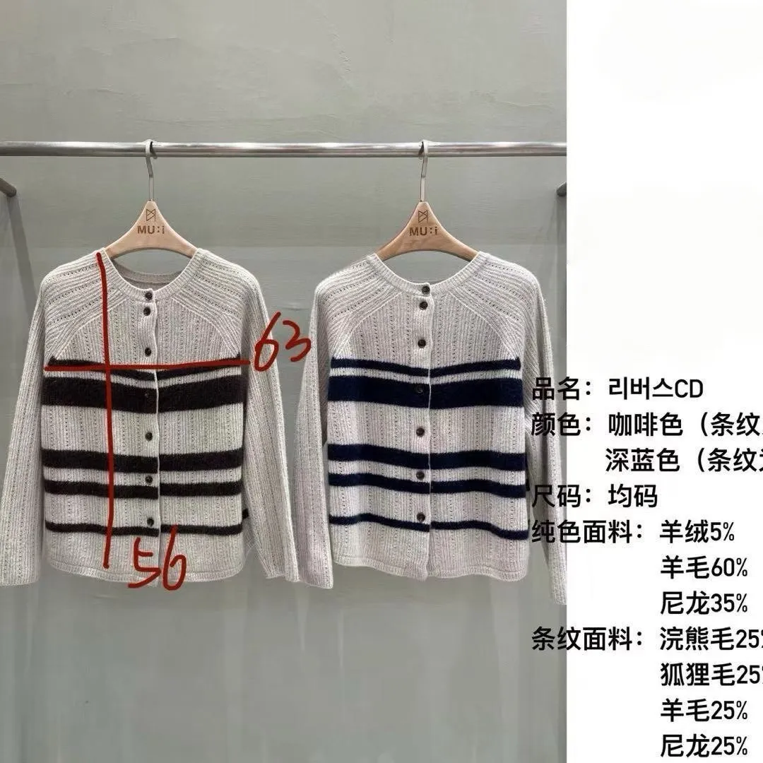 A54 1104氣質歐膩家異材質橫條排釦圓領動物毛簍空針織上衣