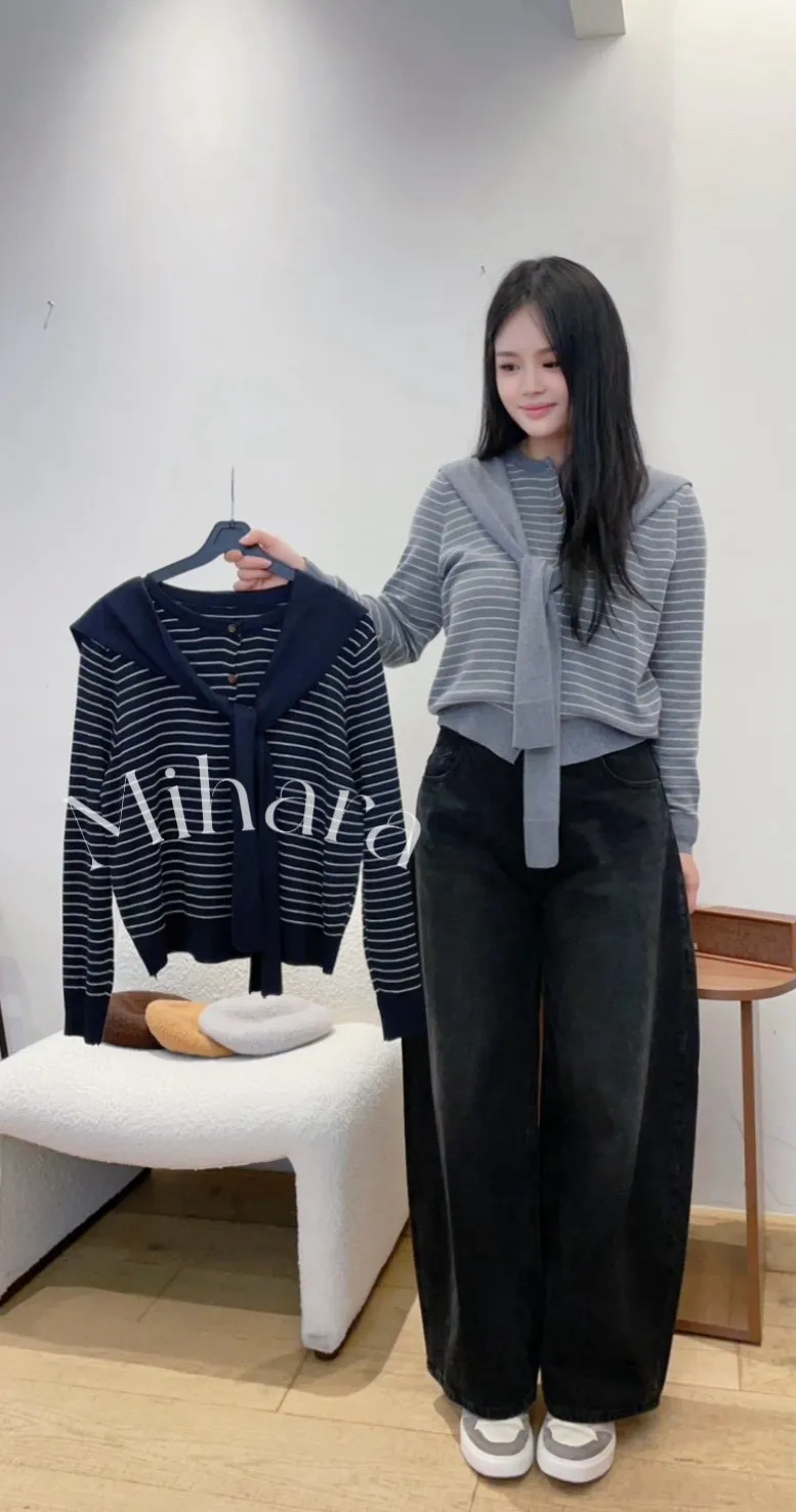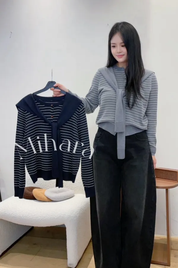 A1 1105高檔Ab家條紋排釦圓領針織T恤附披肩