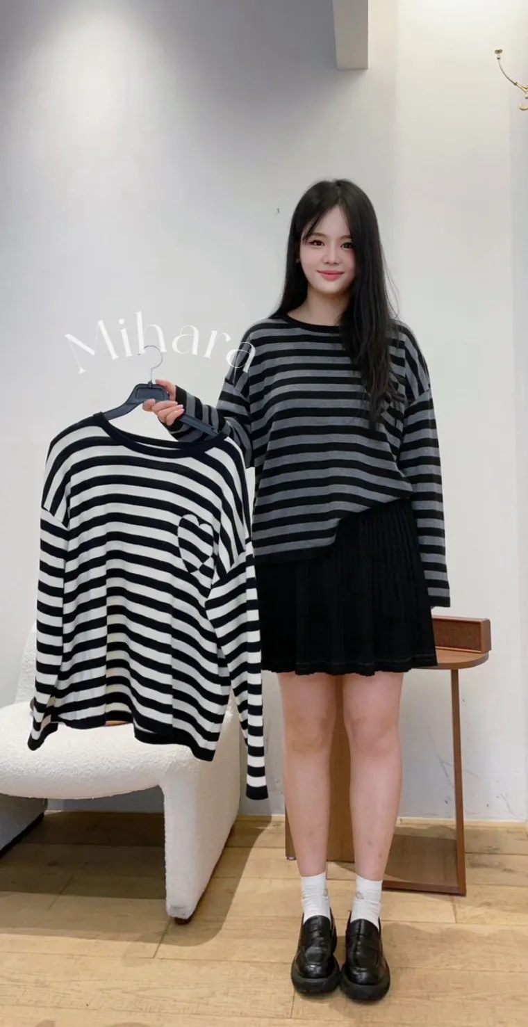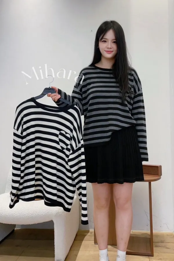A12 1105高檔Ab家愛心條紋圓領天絲混羊毛針織上衣