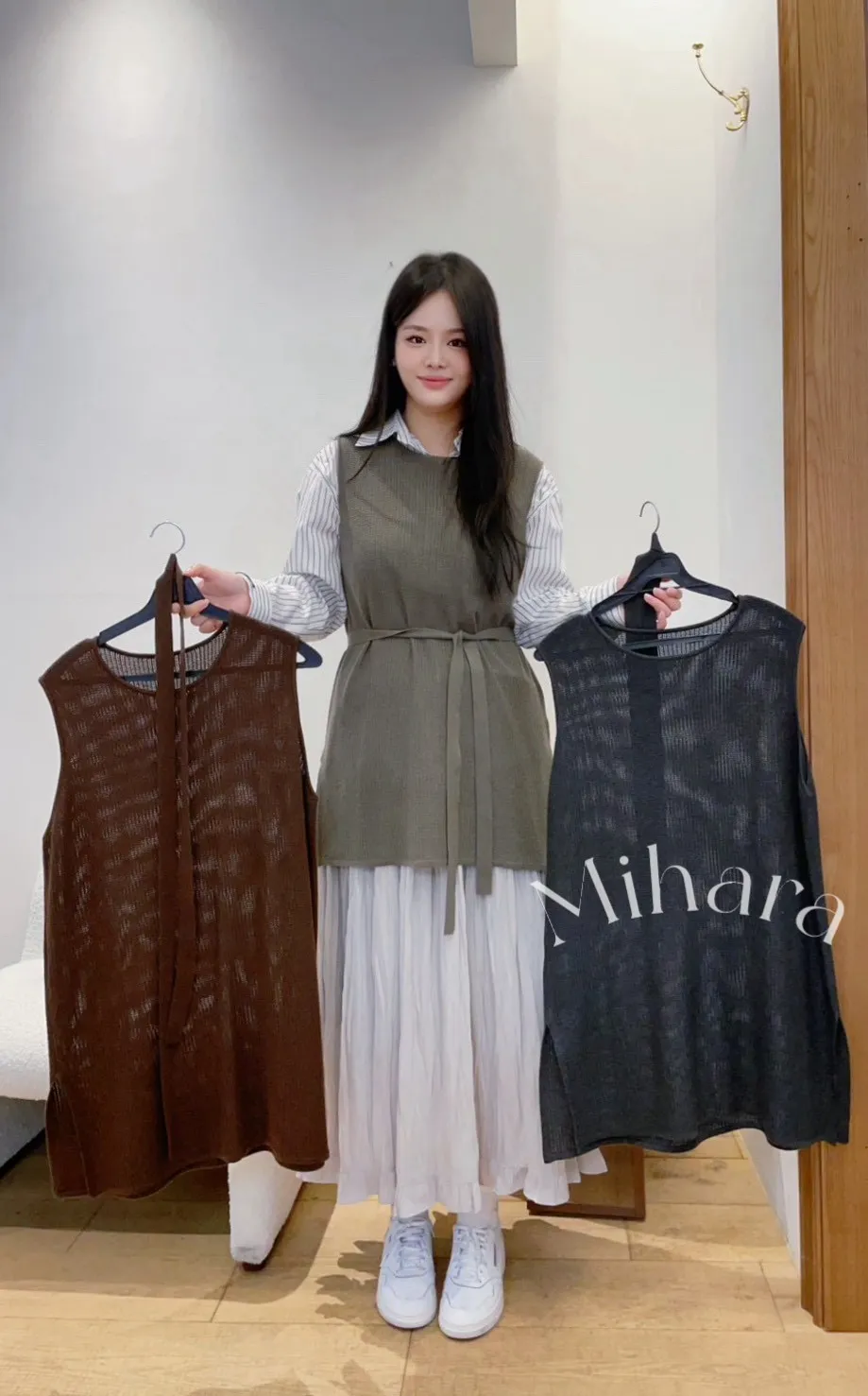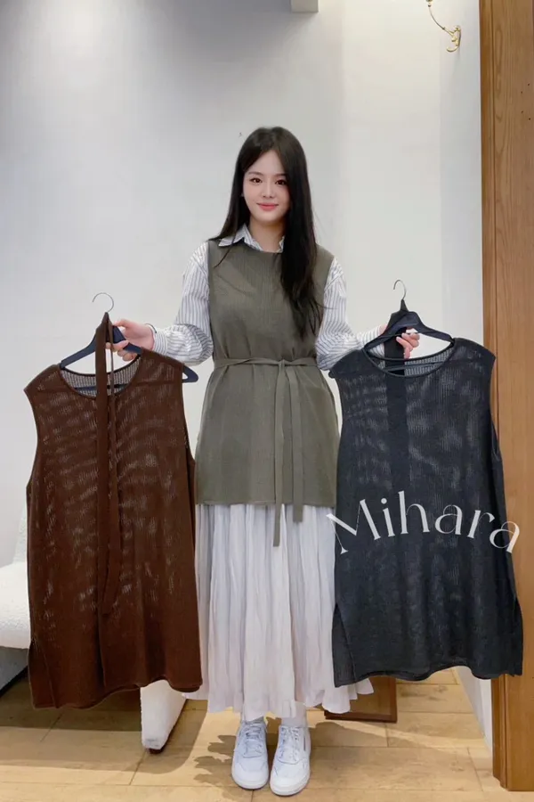 A22 1105高檔Ab家側開衩圓領羊毛50%針織背心罩衫附綁帶