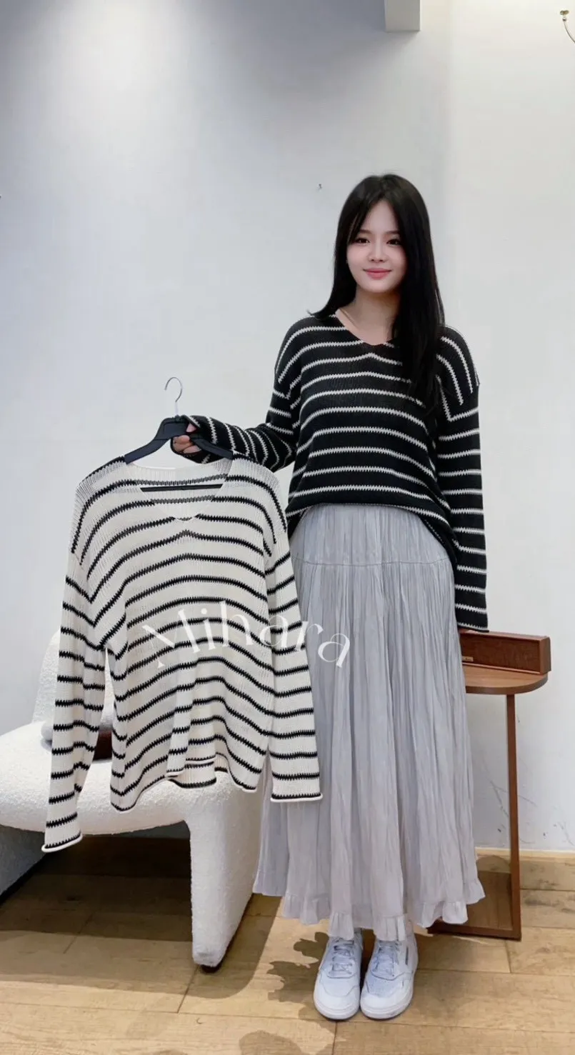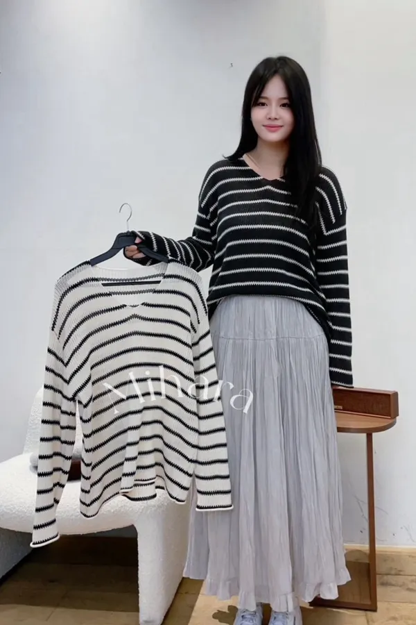 A24 1105高檔Ab家條紋V領天絲混人造絲針織上衣