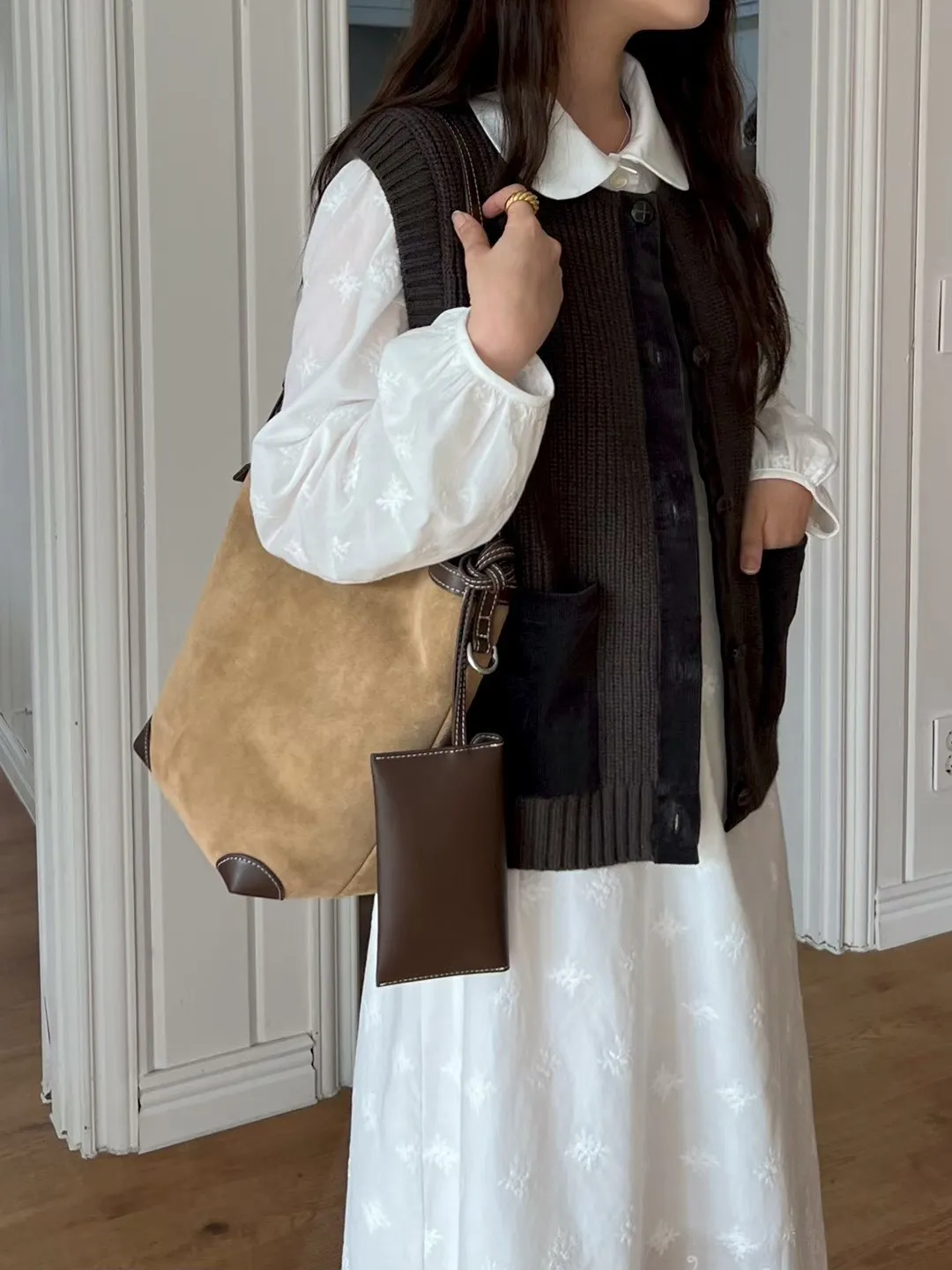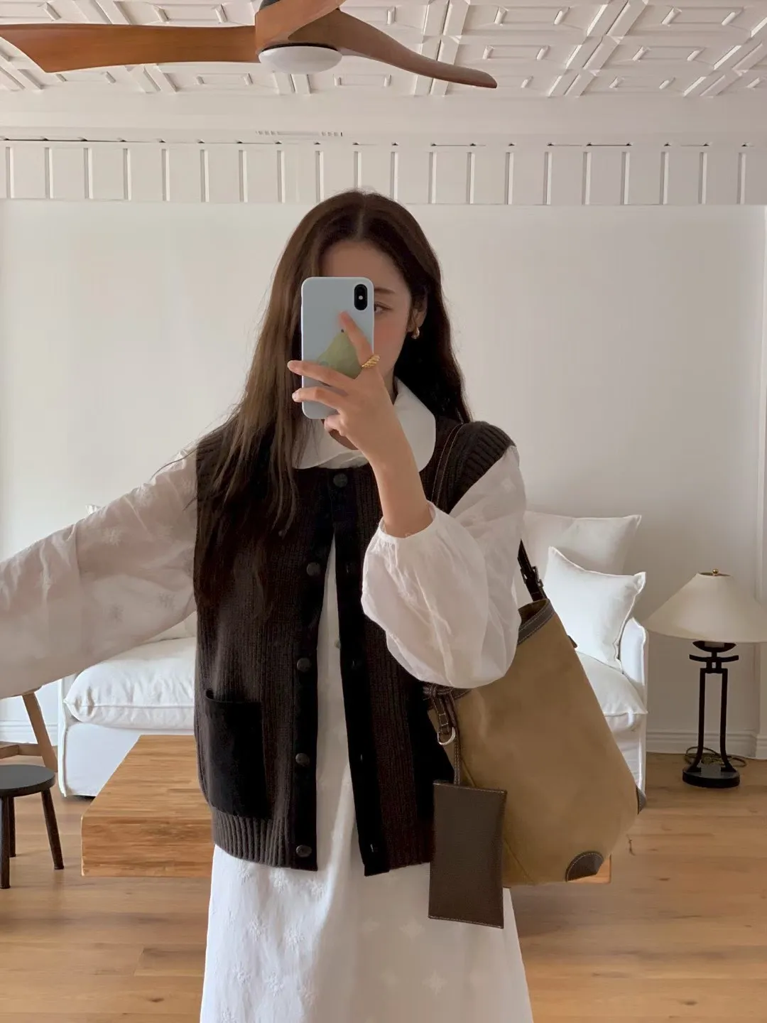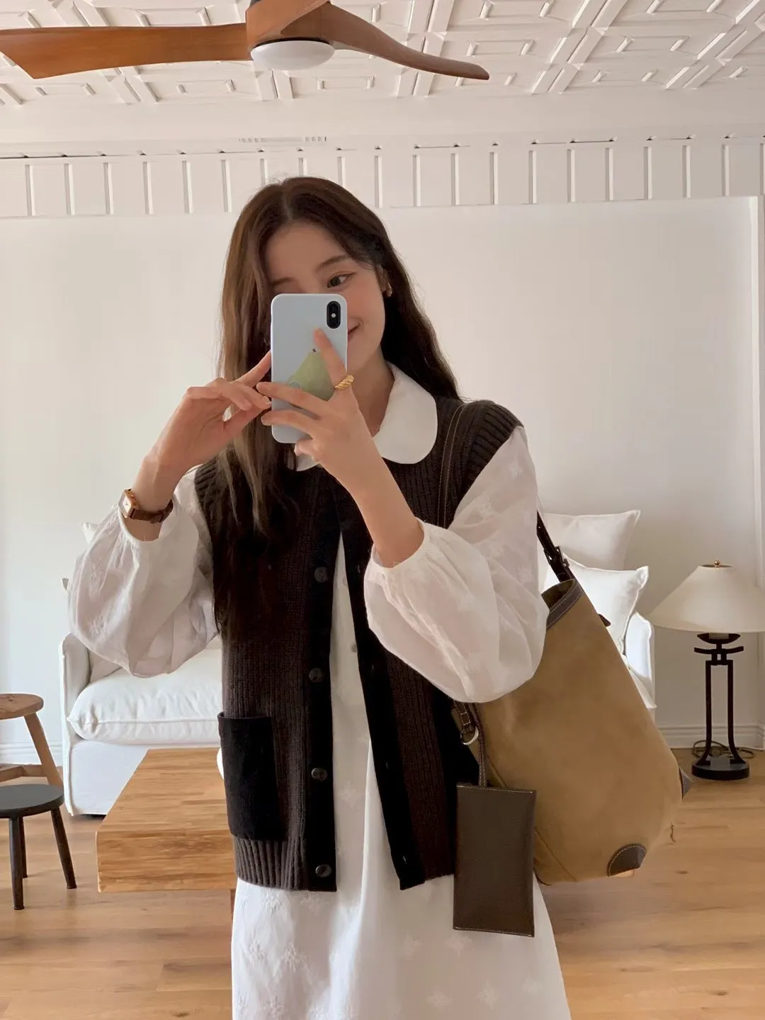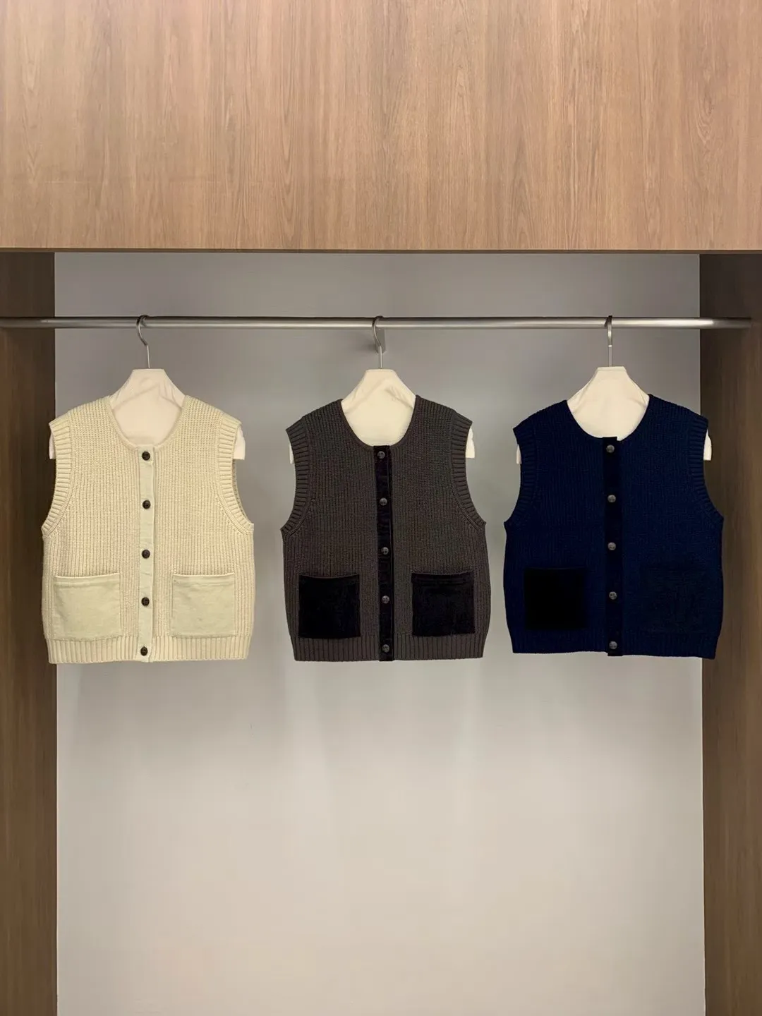 A41 1105超美質感家拼接燈芯絨口袋排釦圓領羊毛100%針織背心