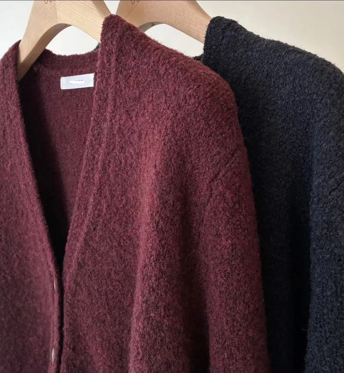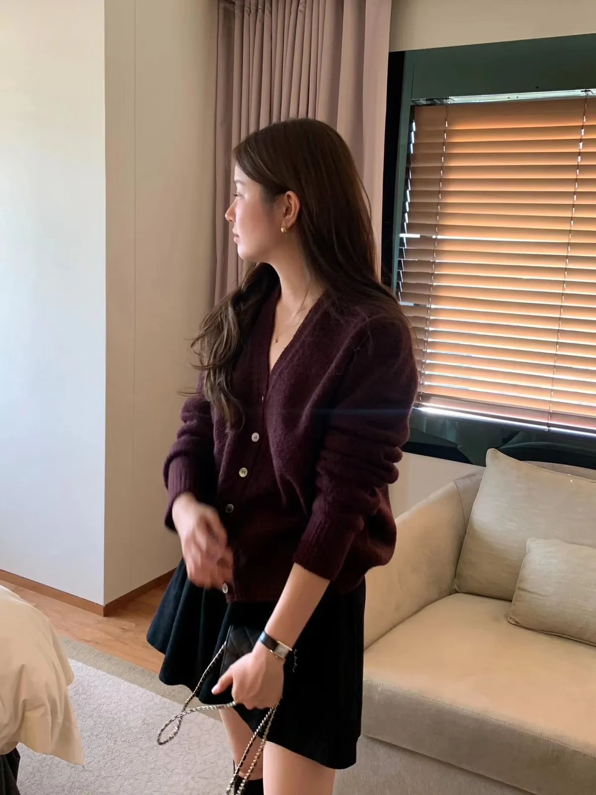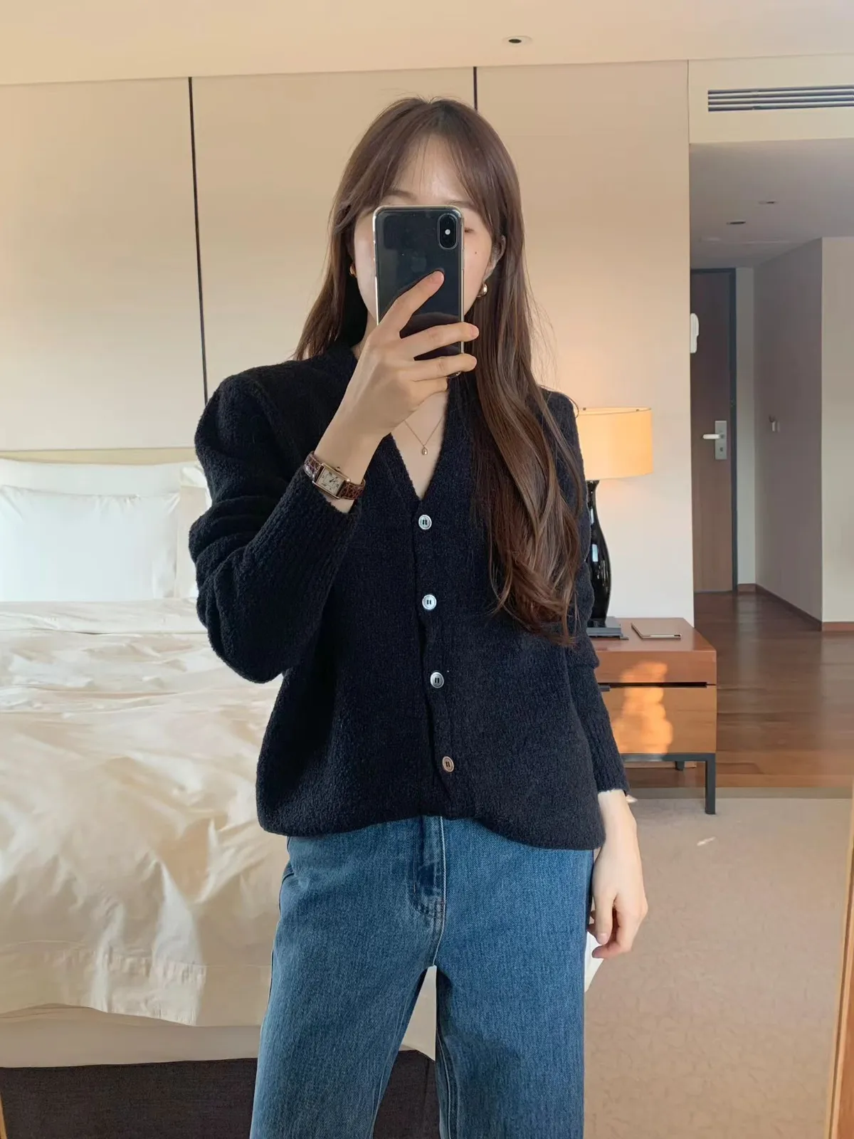 E243高檔OU羊毛混紡排扣V領罩衫2色