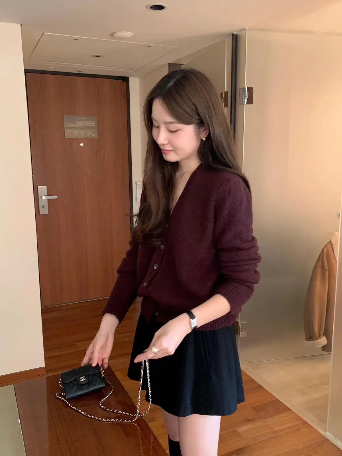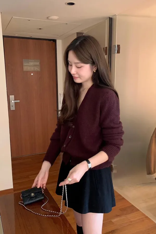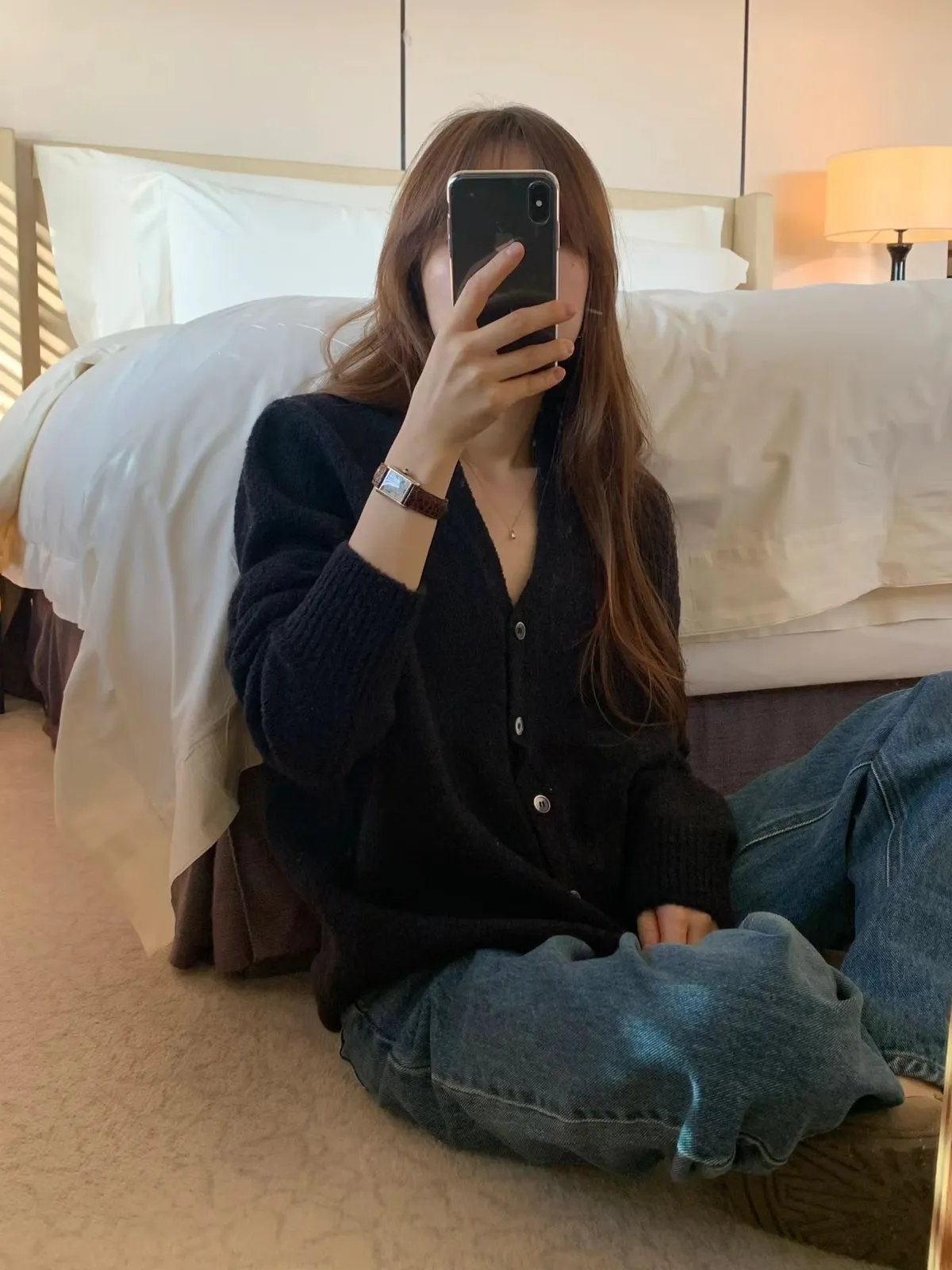 E243高檔OU羊毛混紡排扣V領罩衫2色