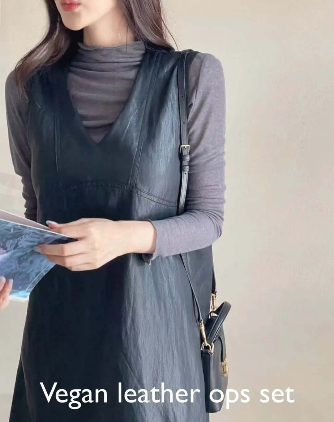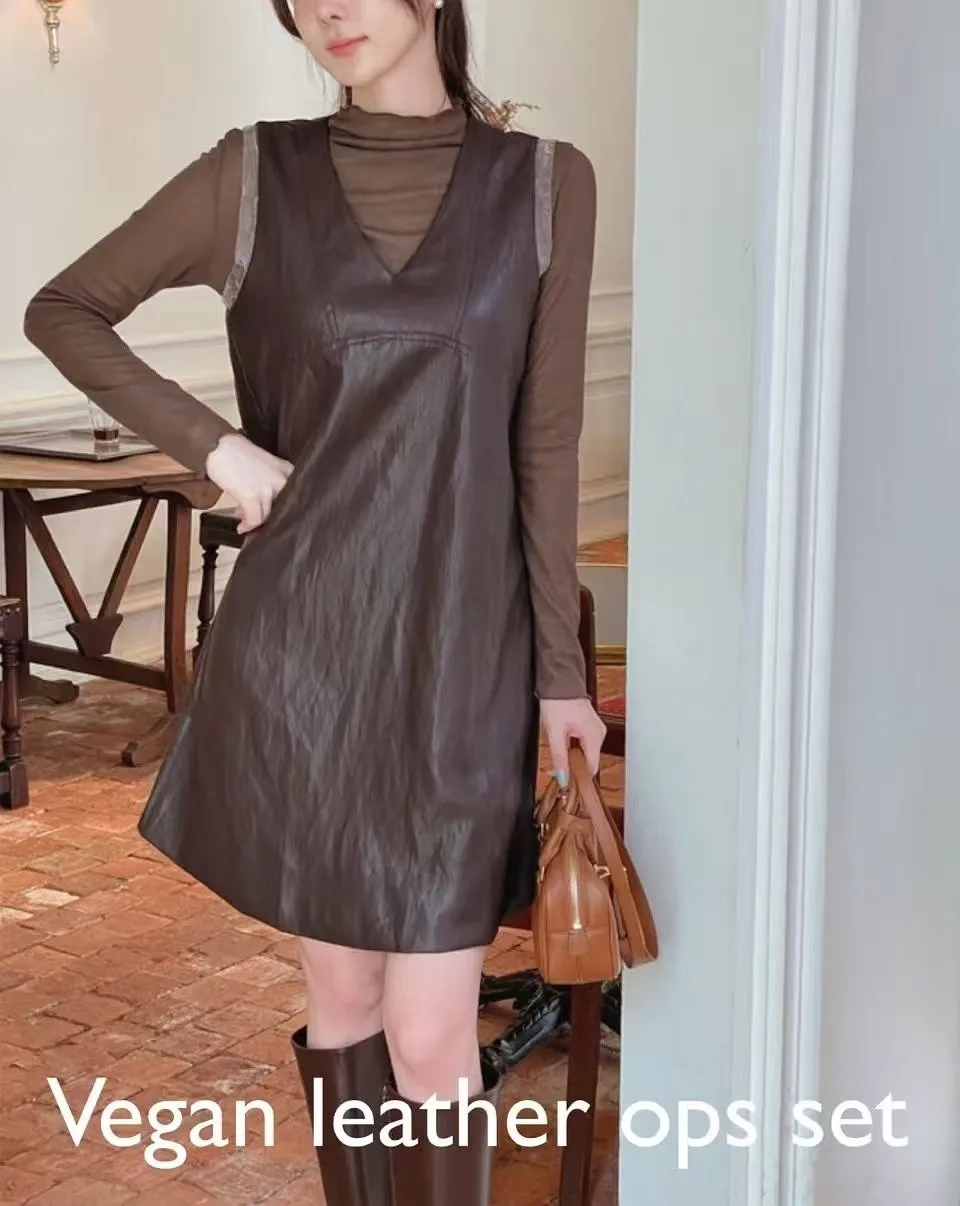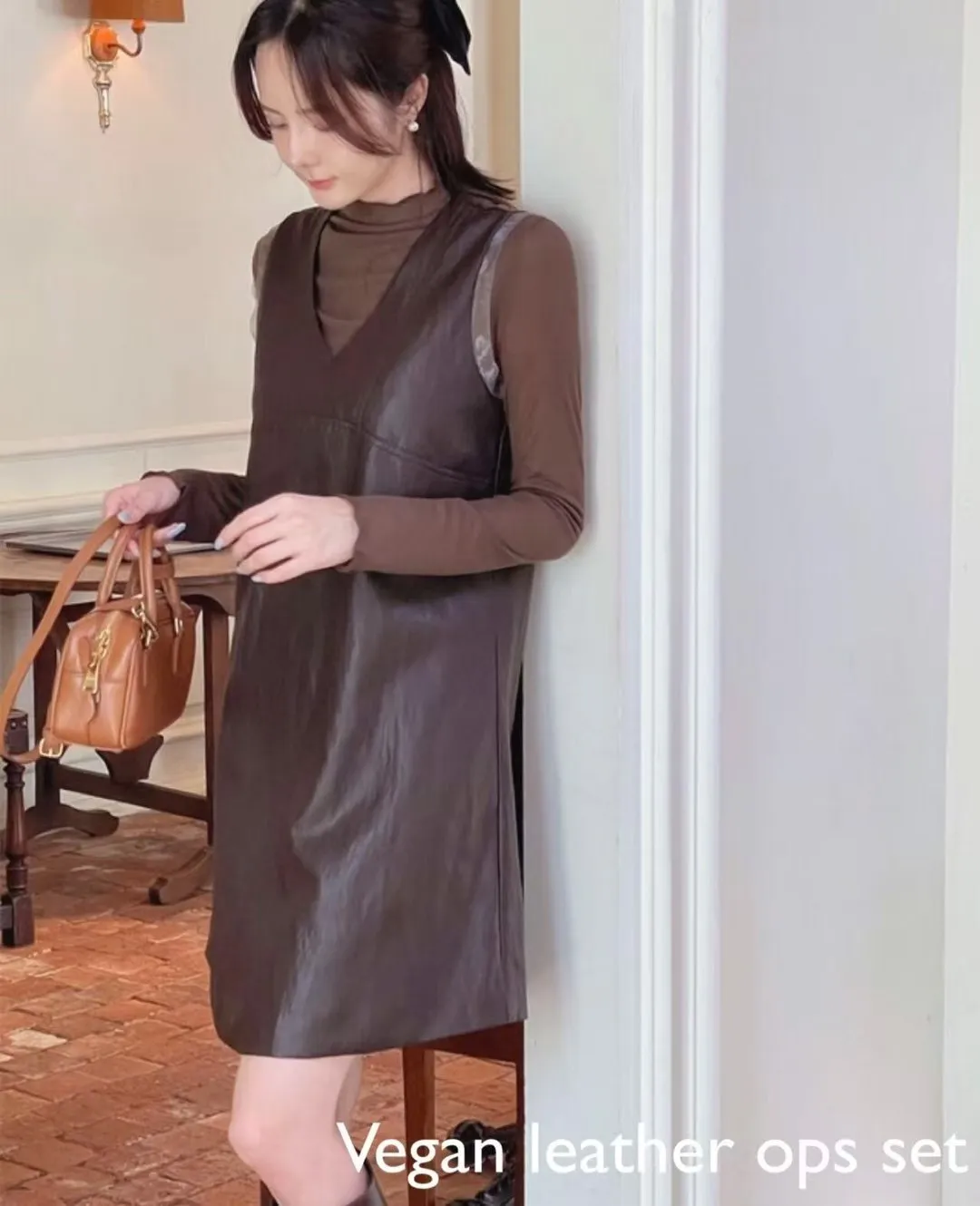 1109木耳上衣+V領仿皮革背心洋裝(set)2色