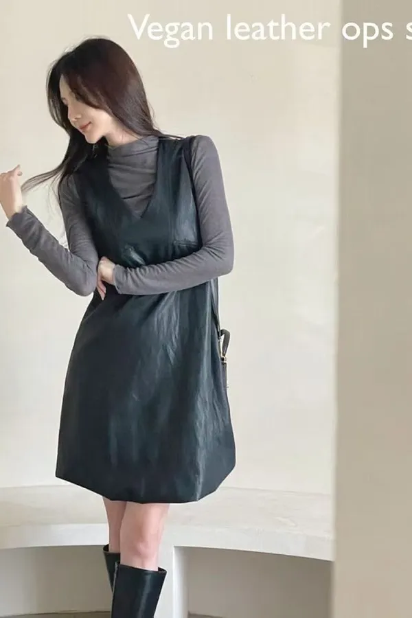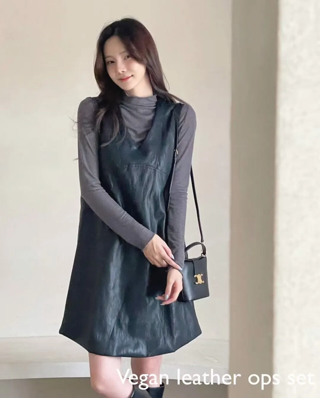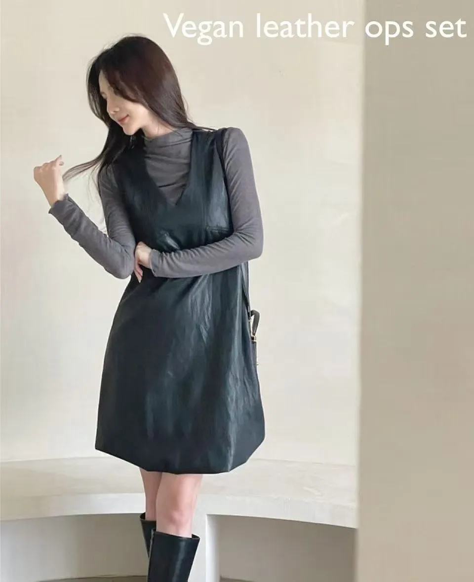 1109木耳上衣+V領仿皮革背心洋裝(set)2色