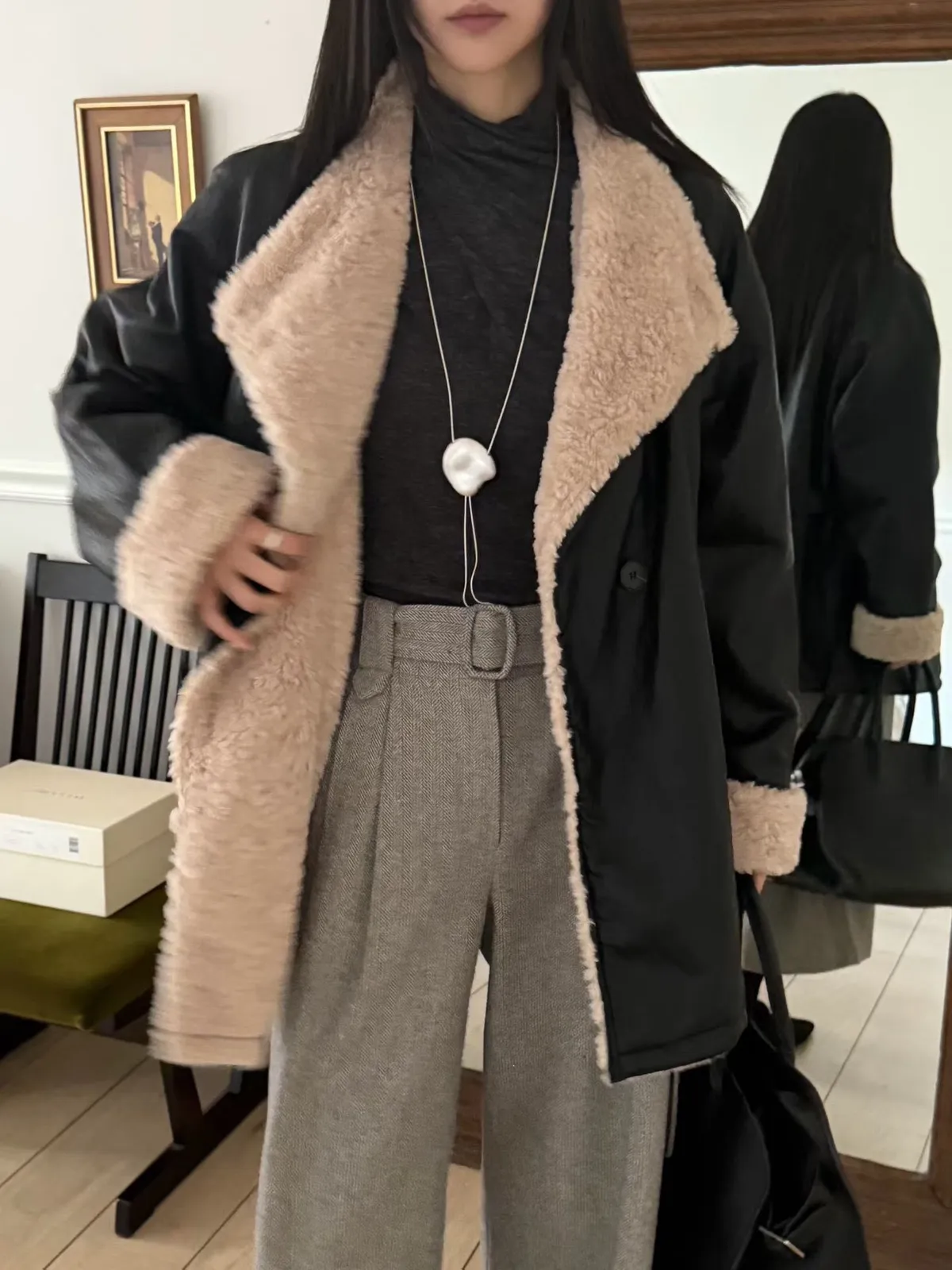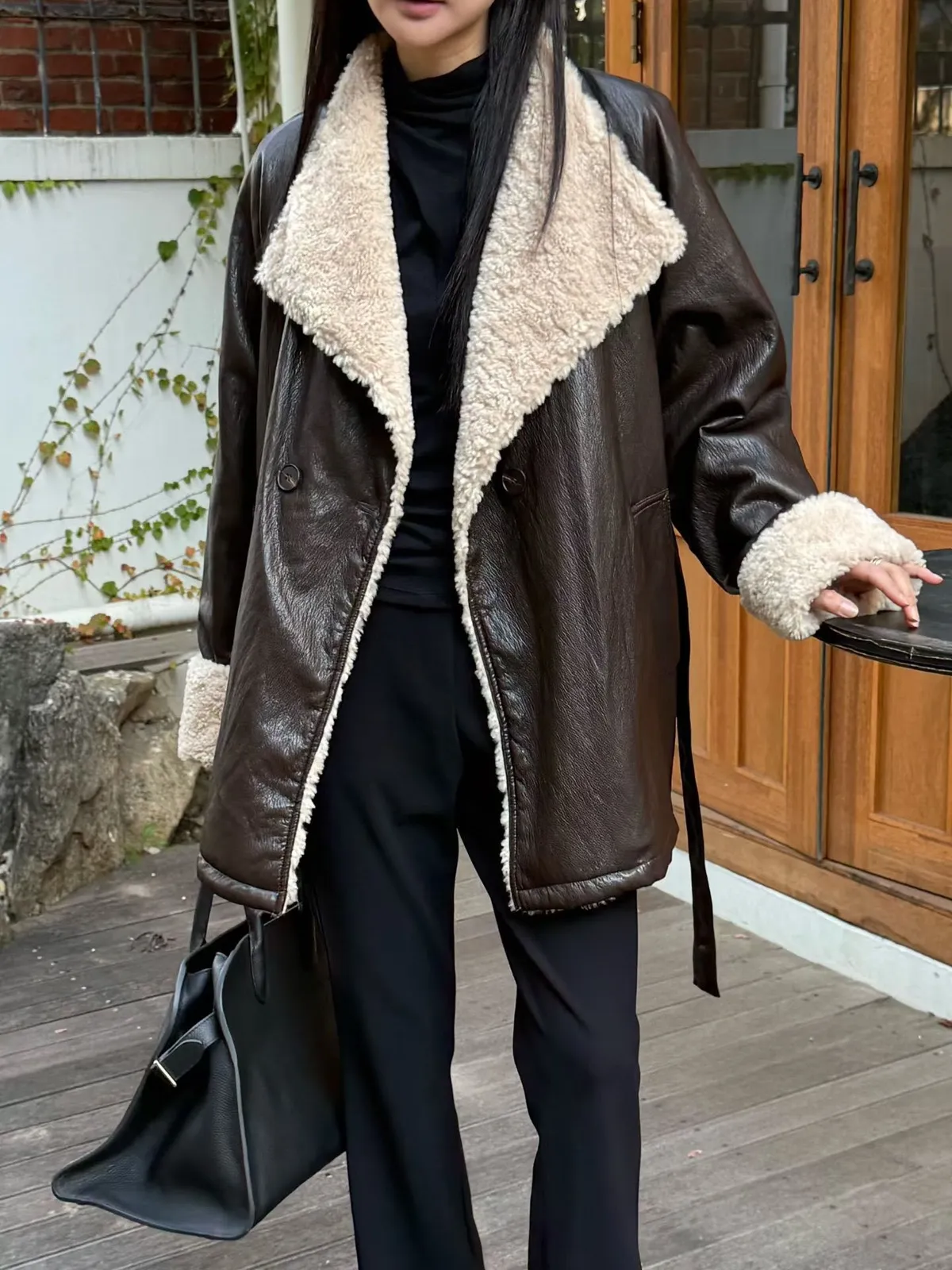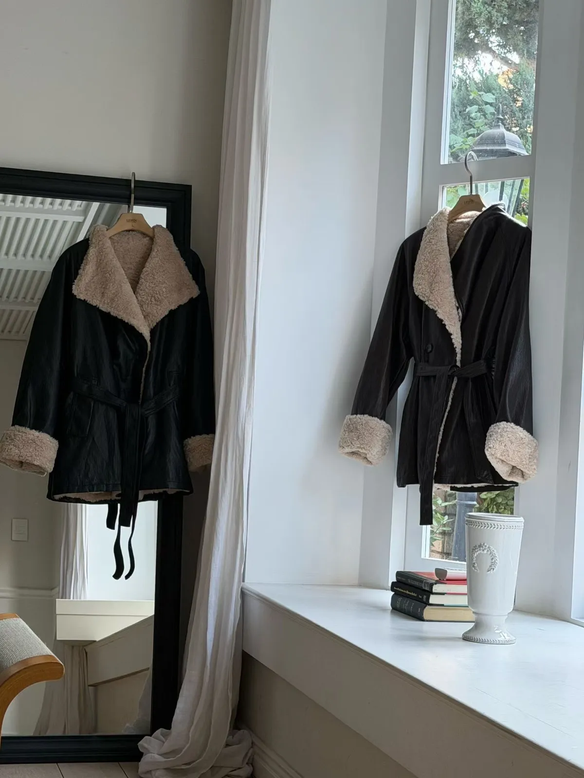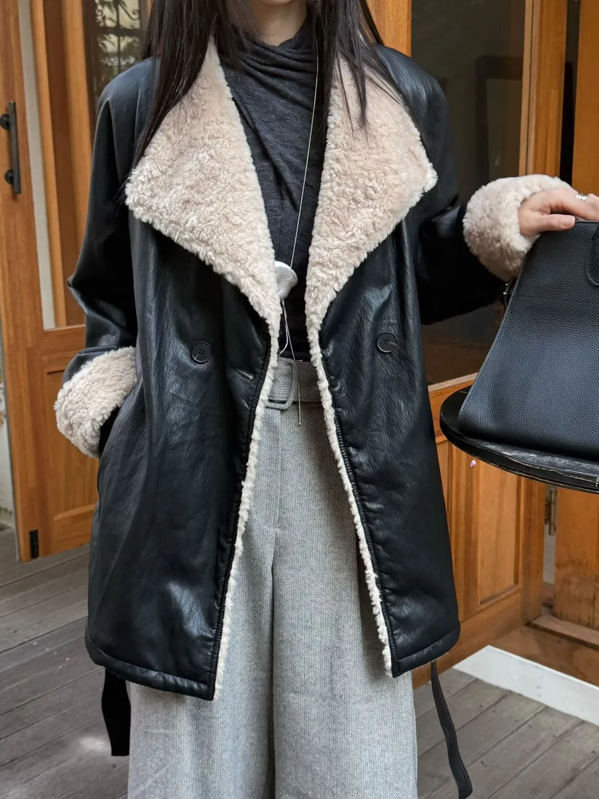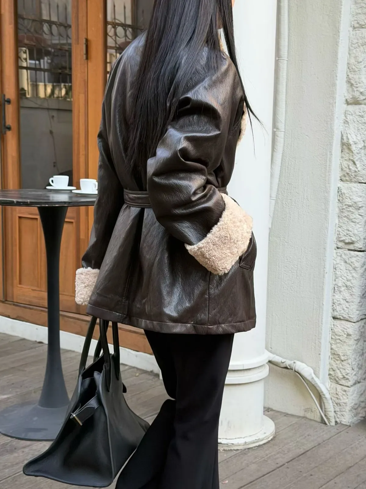 E230高檔名媛家內裡拼接毛毛翻領皮外套(附綁帶)