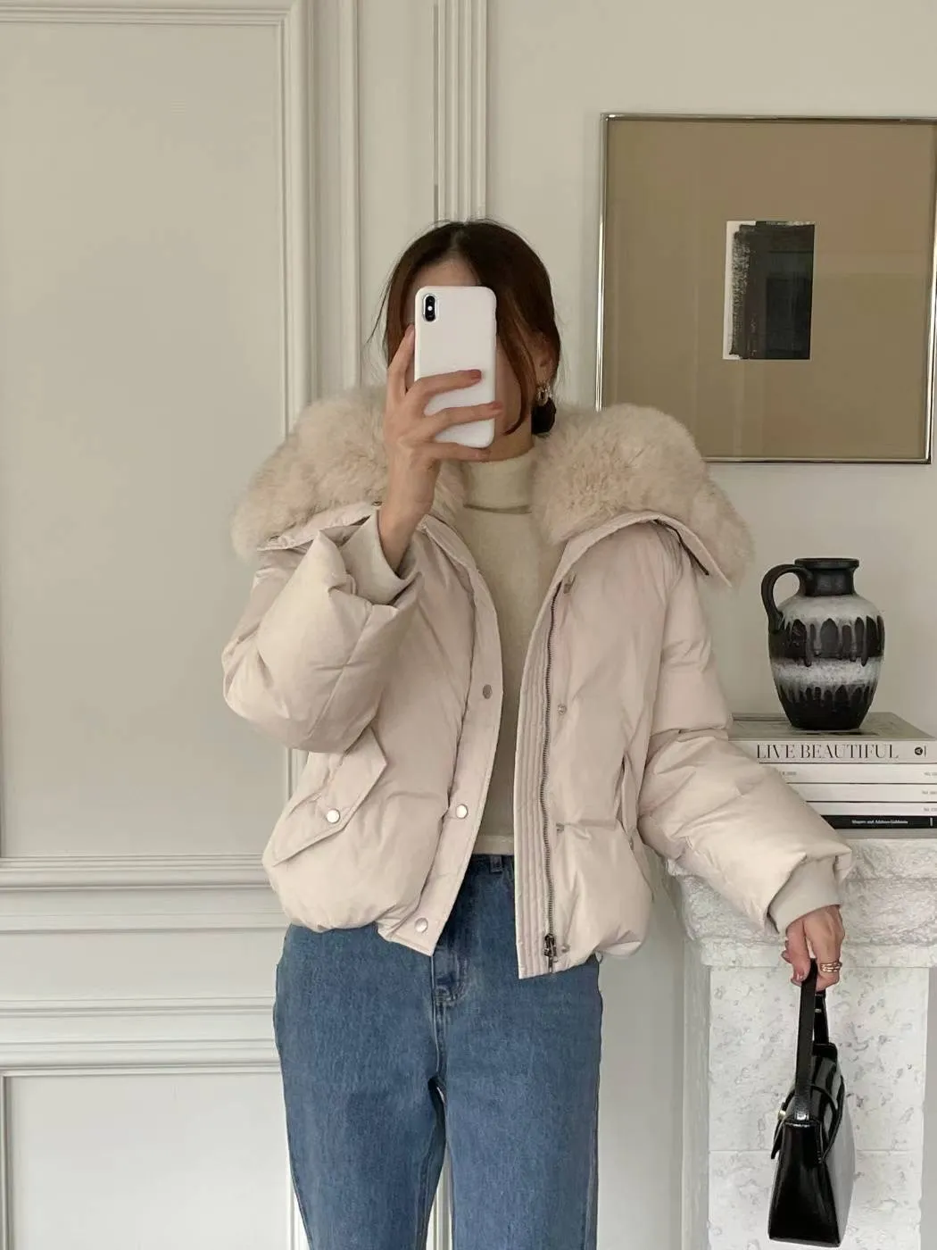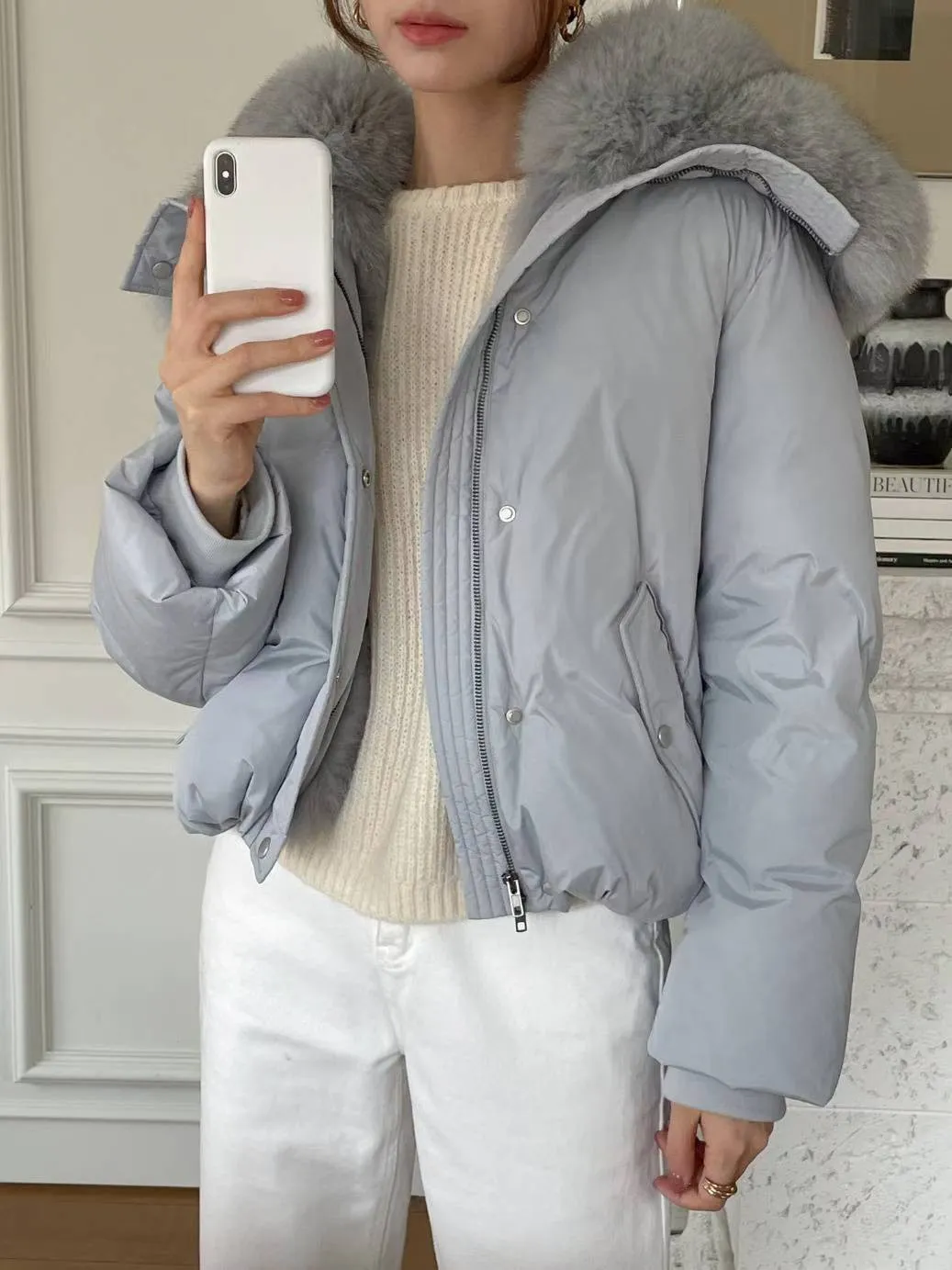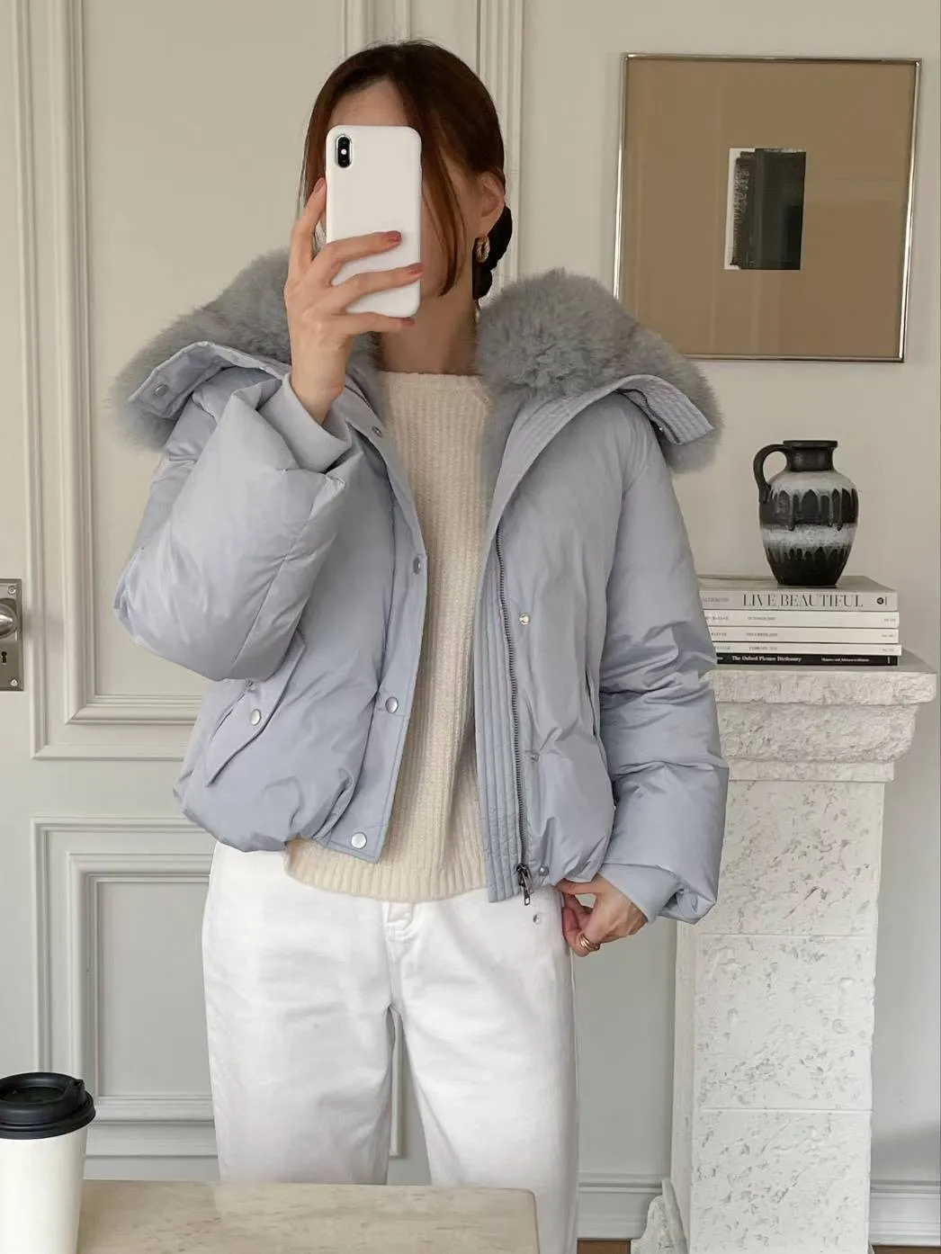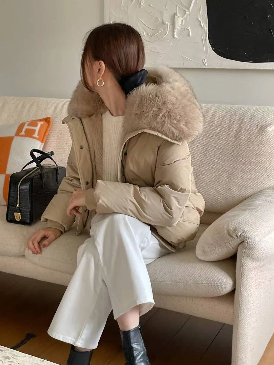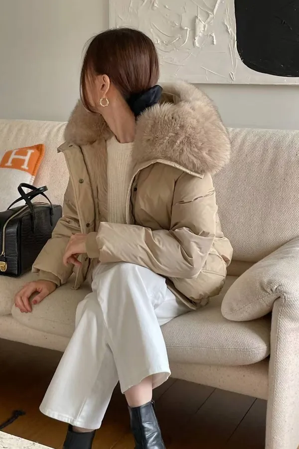 A23 1112質感設計家拼接異材質狐狸毛連帽鵝絨100%外套