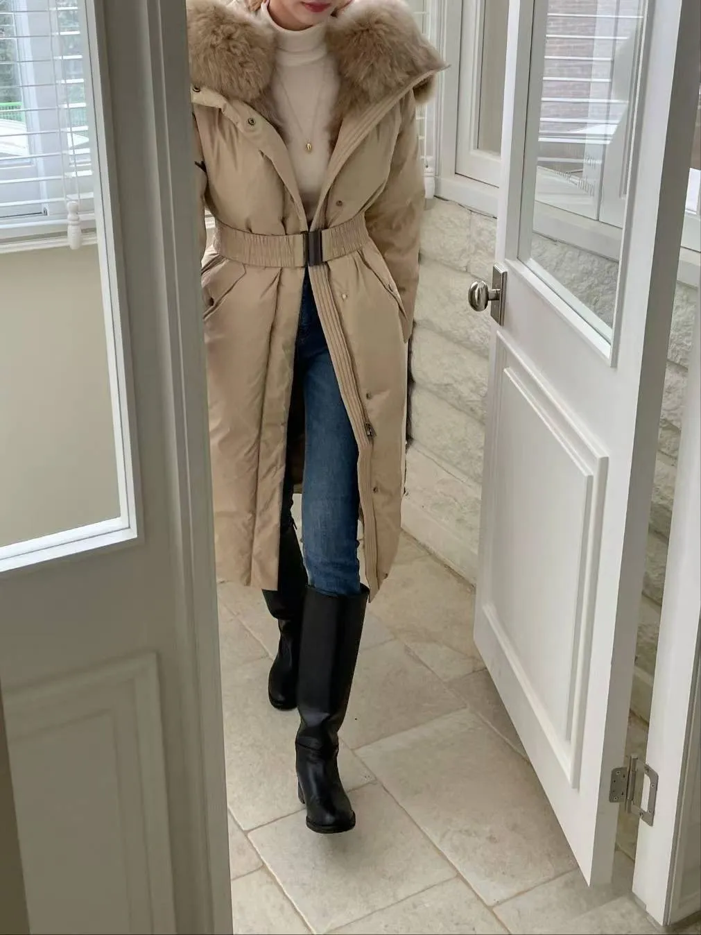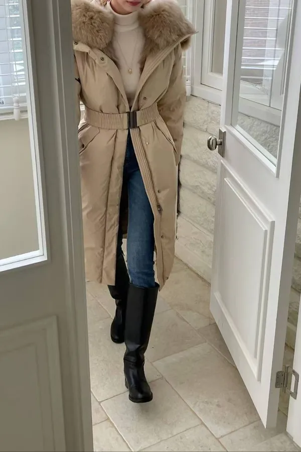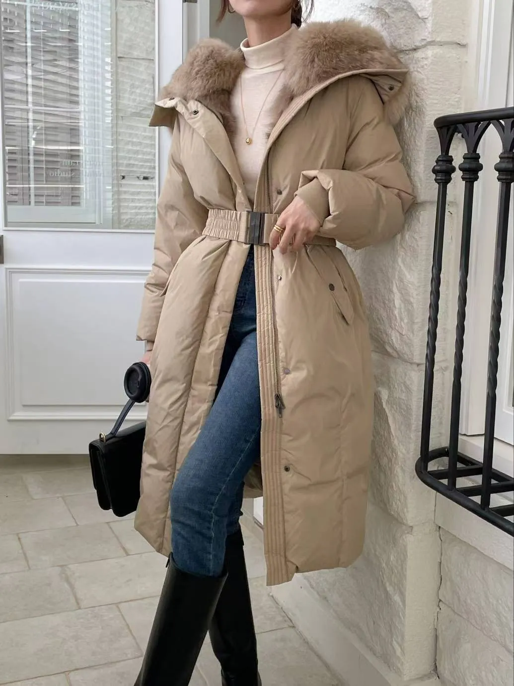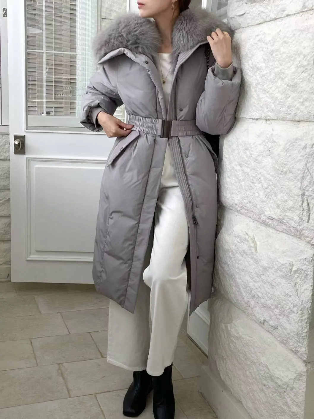 A27 1112質感設計家拼接異材質狐狸毛連帽鴨絨100%大衣外套附腰帶