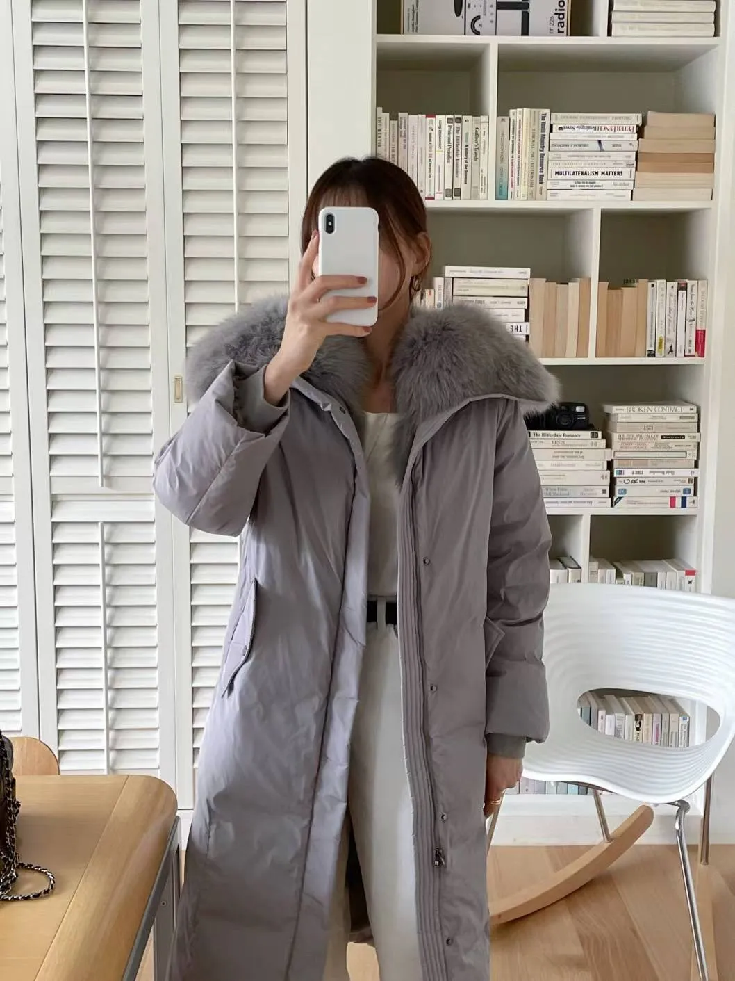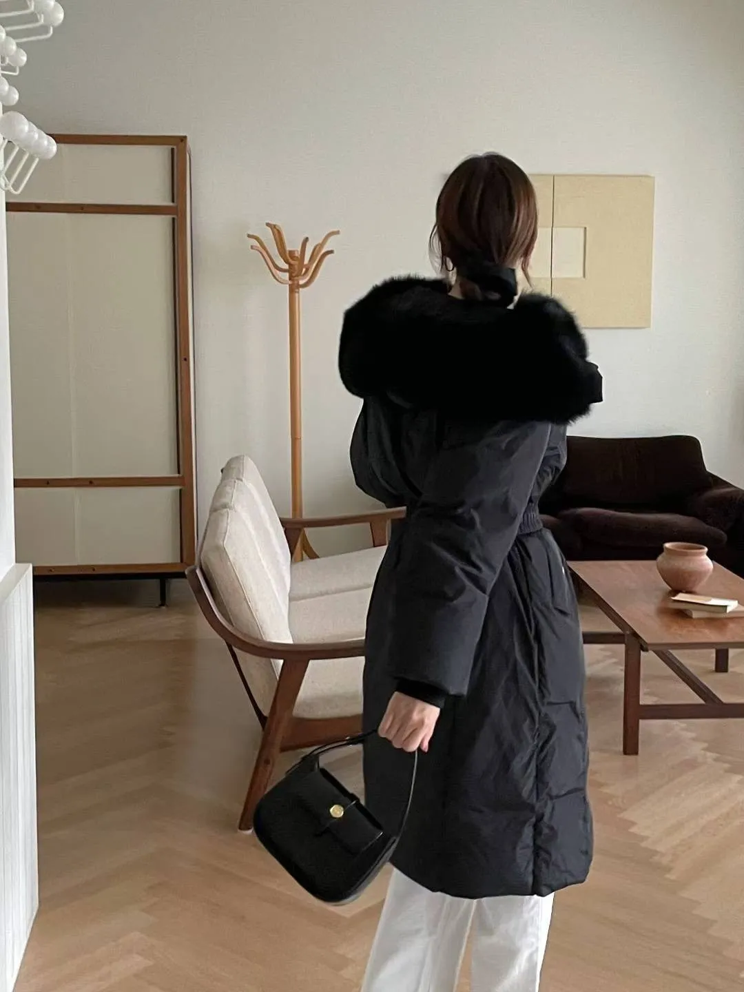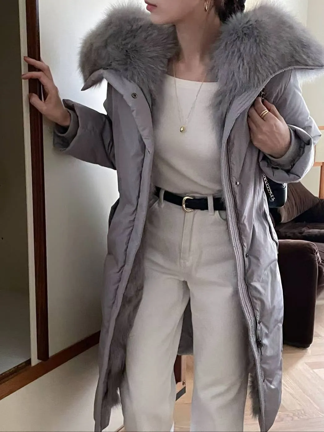 A27 1112質感設計家拼接異材質狐狸毛連帽鴨絨100%大衣外套附腰帶