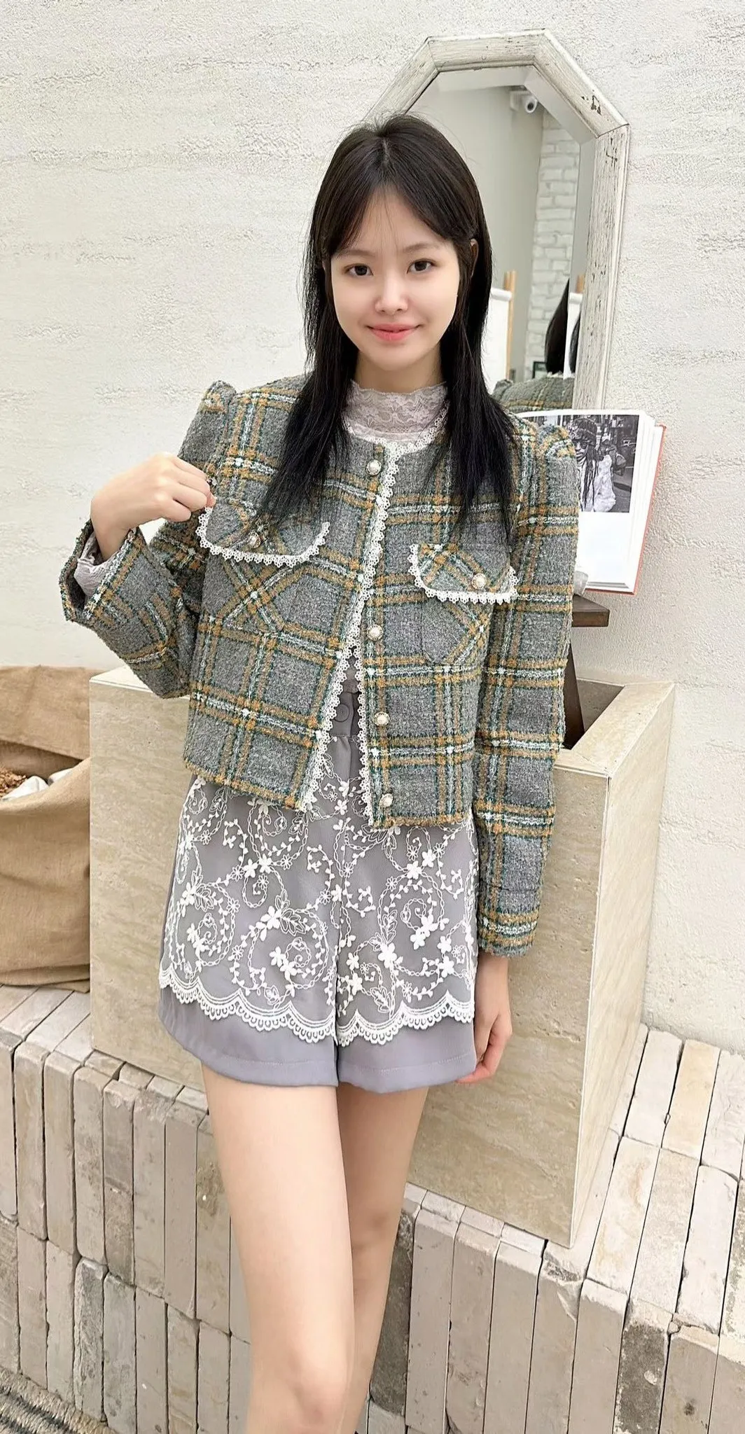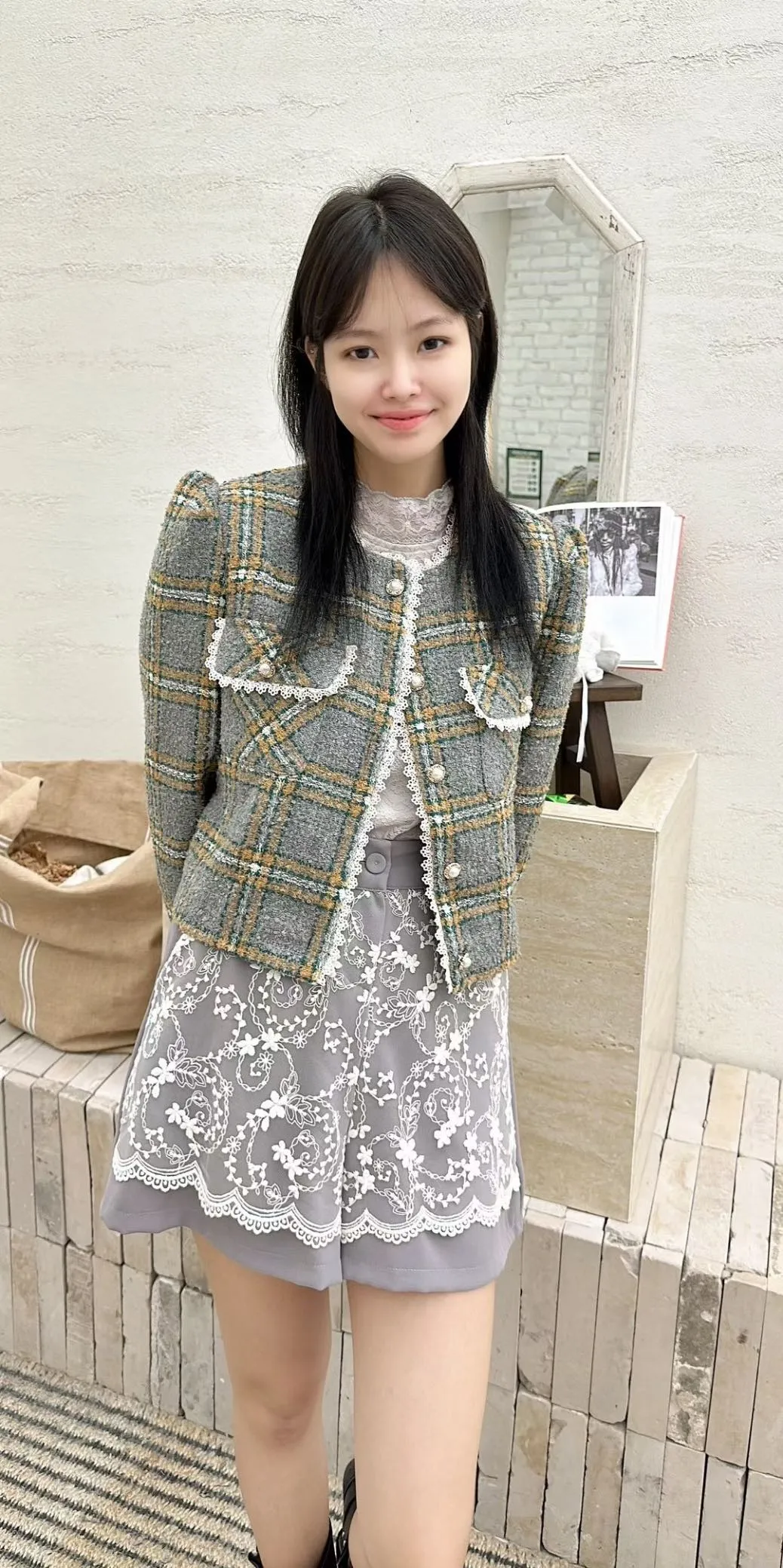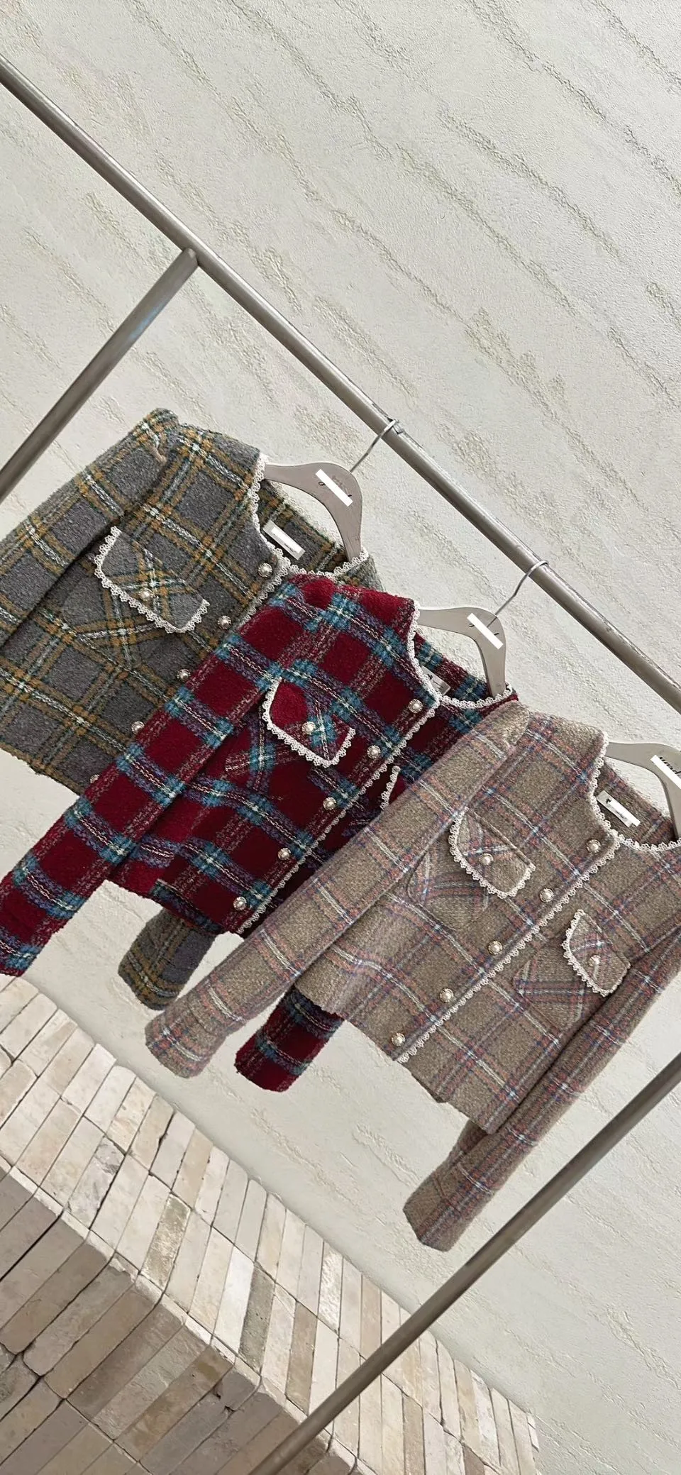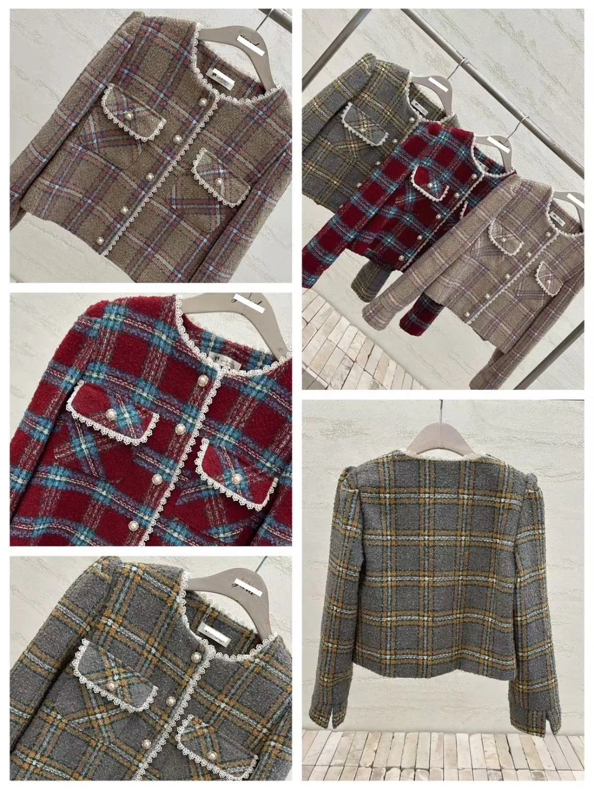 E308高檔甜美30%wool格紋蕾絲滾邊外套