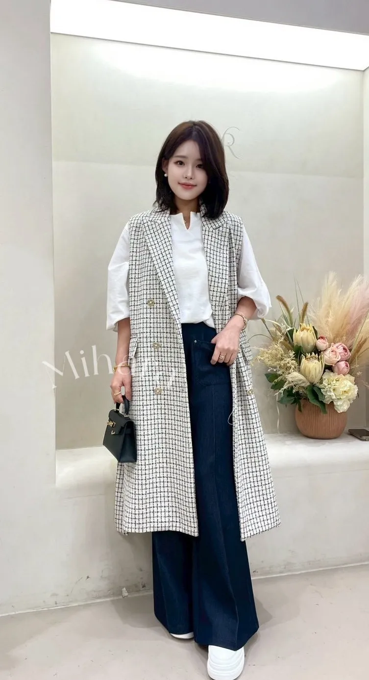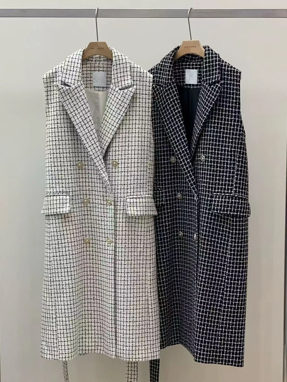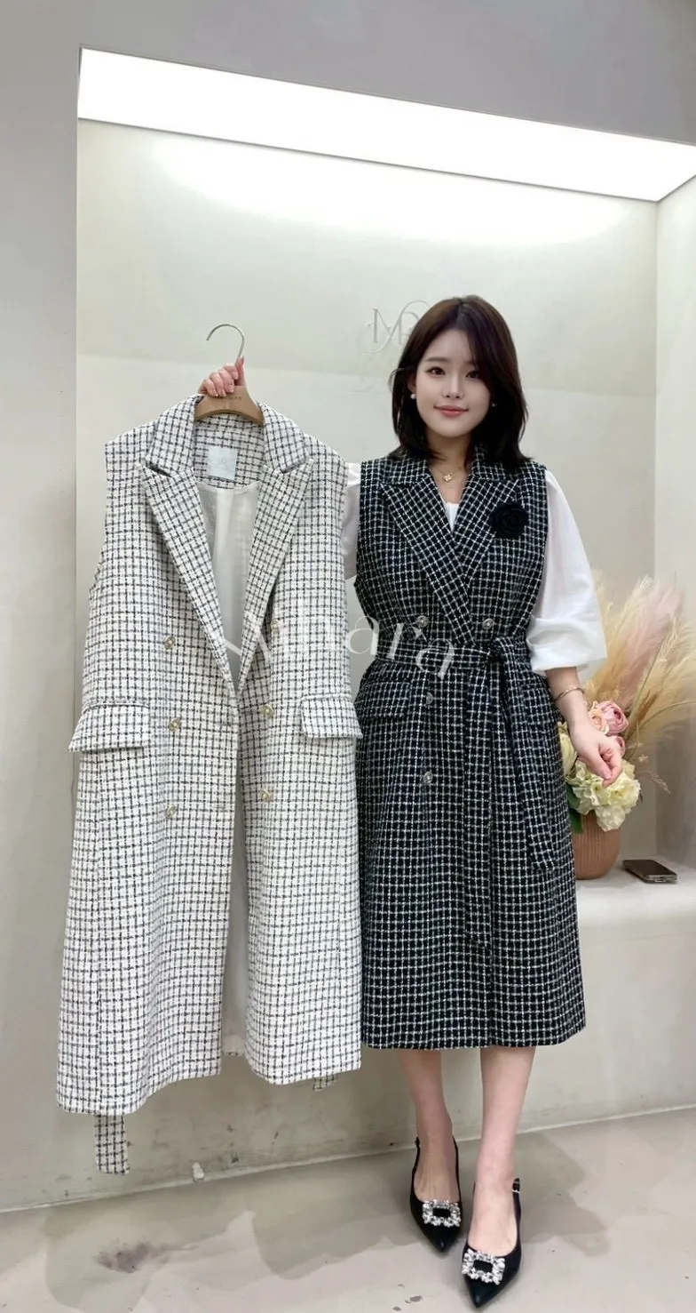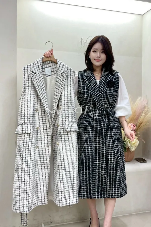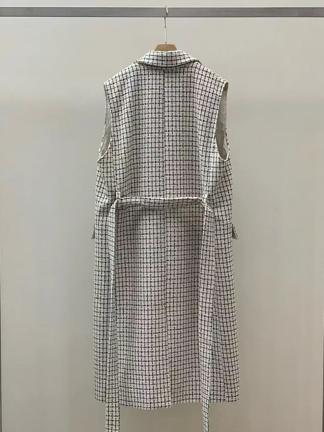 A25 1116可愛歐膩家格紋雙排釦綁帶長風衣背心
