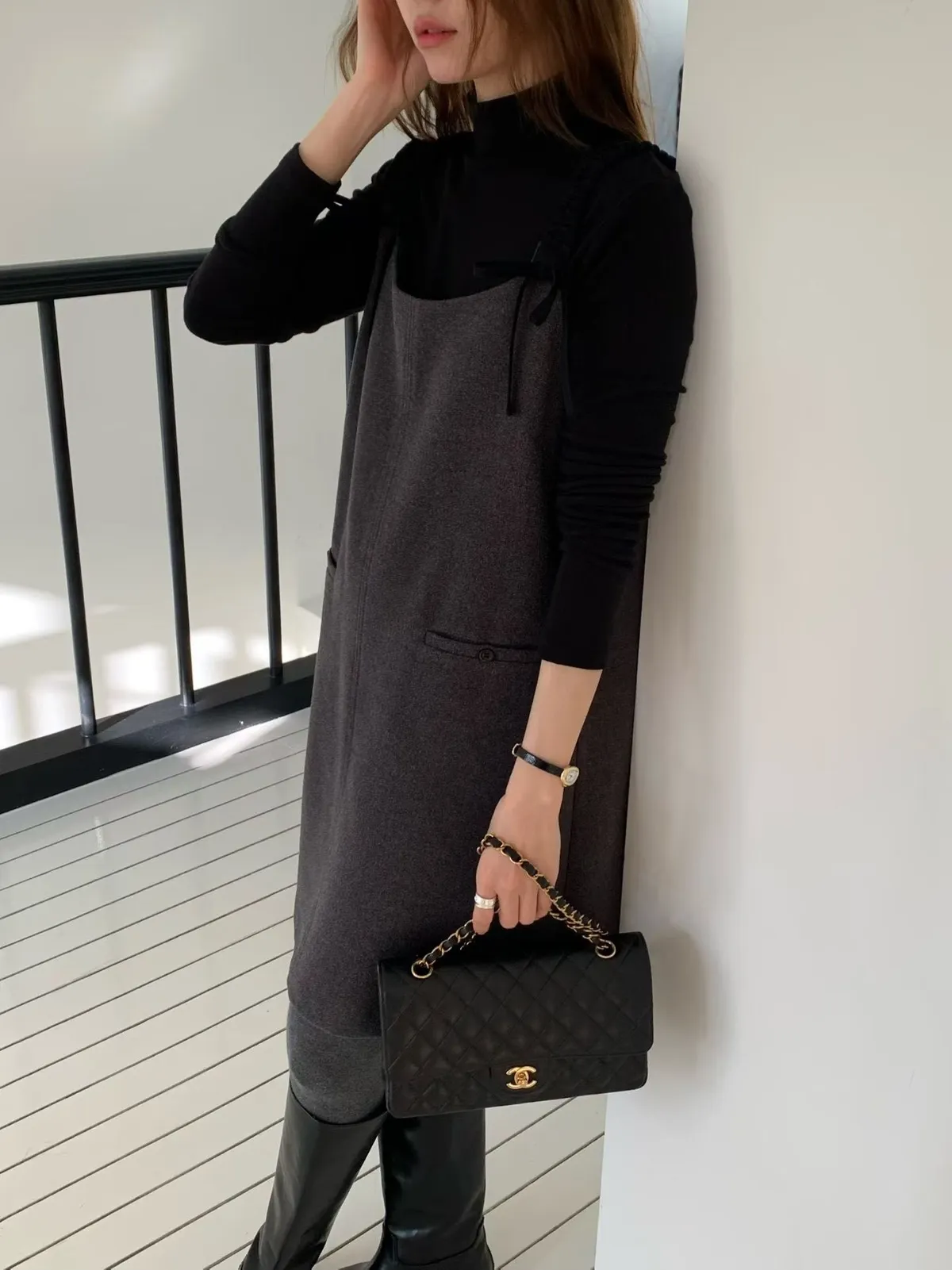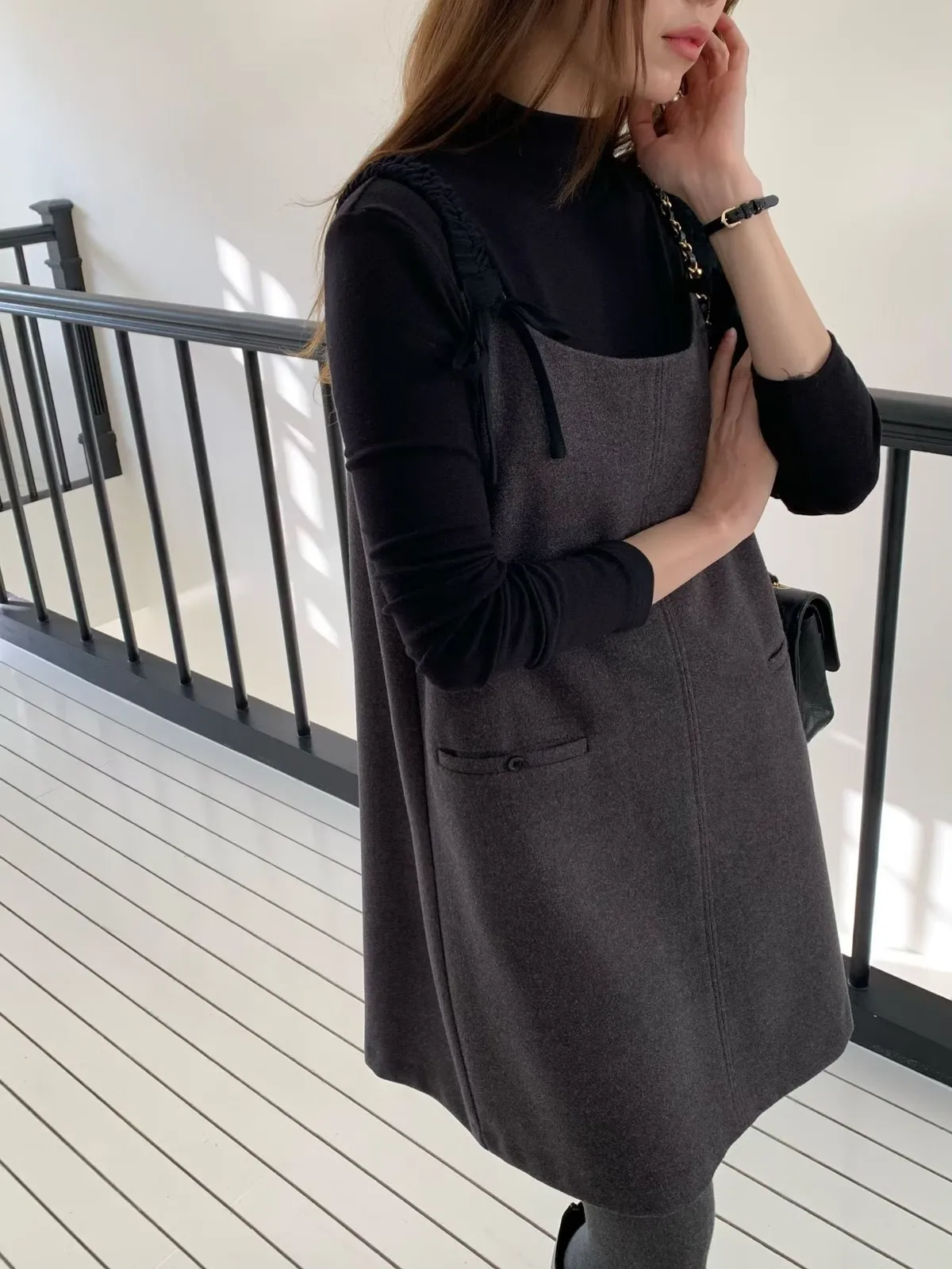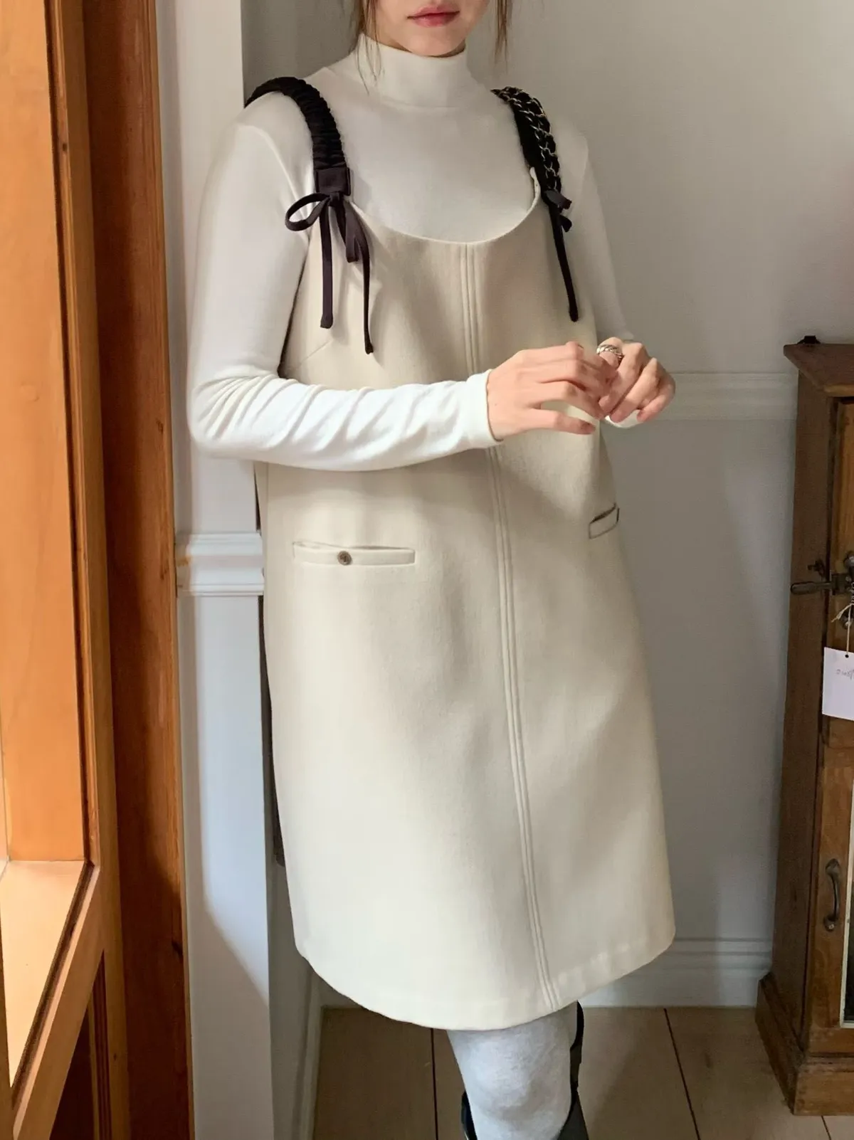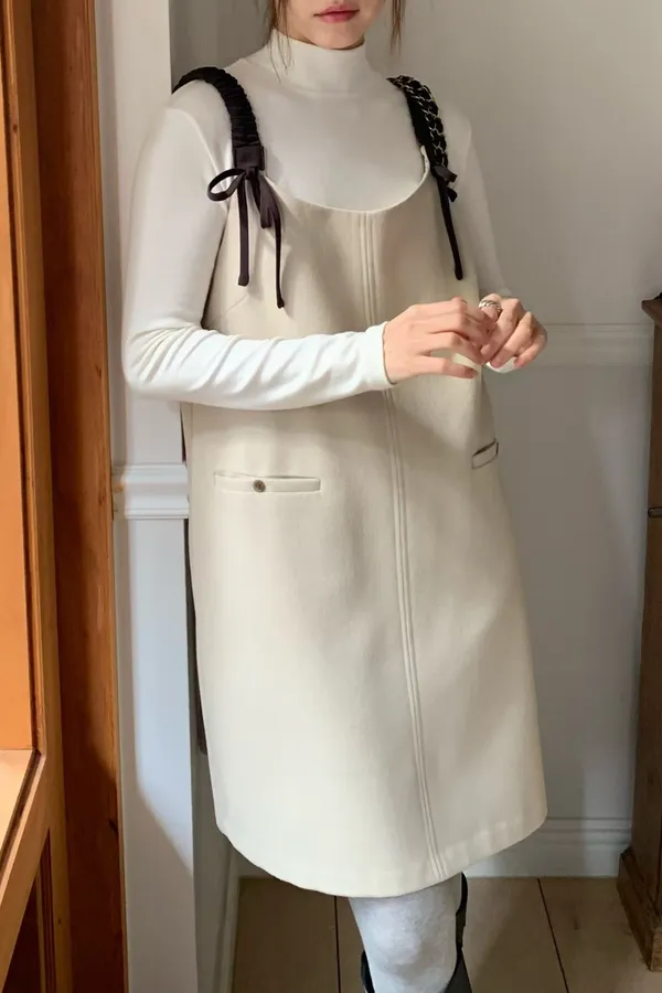 C6(強推)高檔捲髮歐膩雙蝴蝶結羊毛混紡吊帶裙