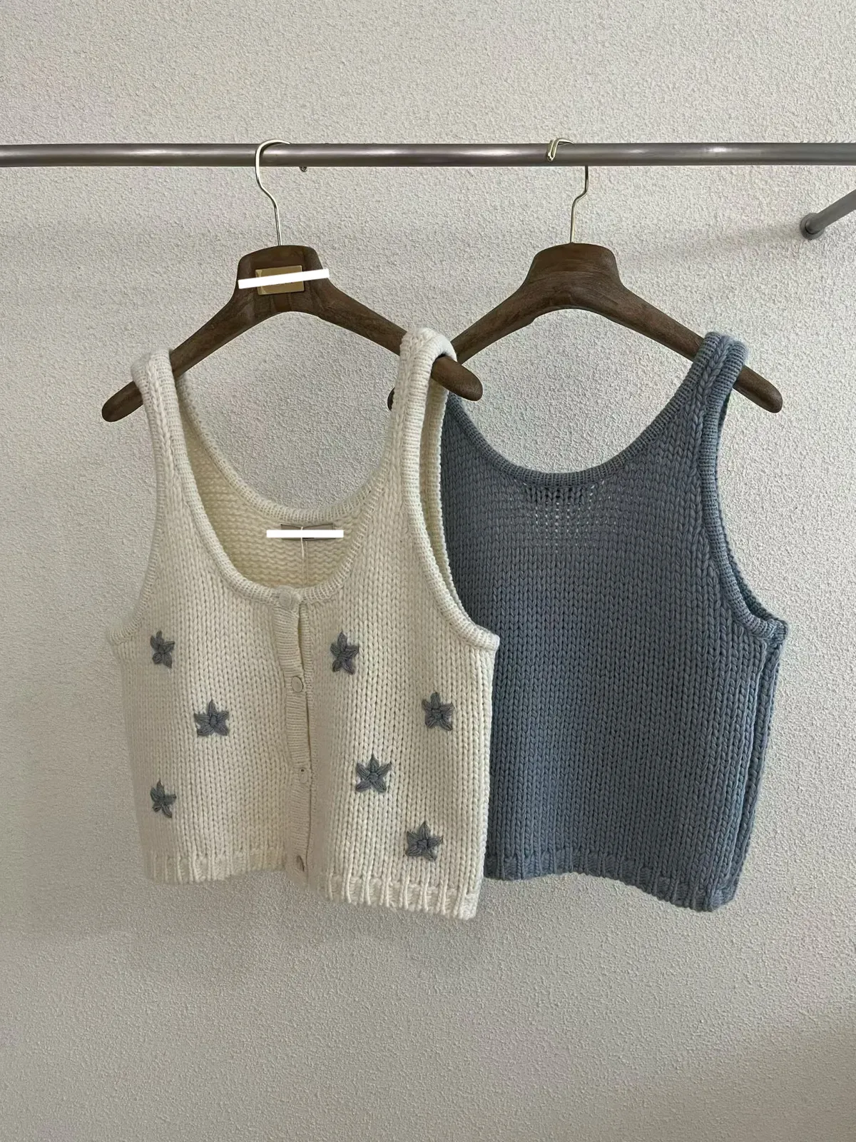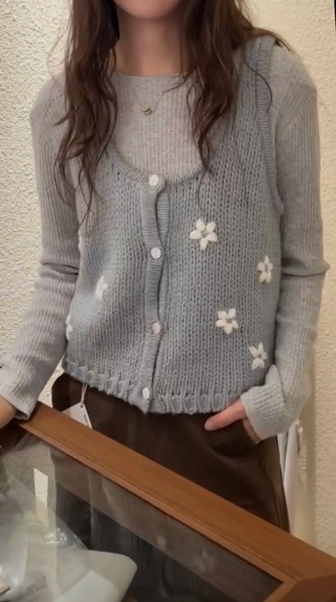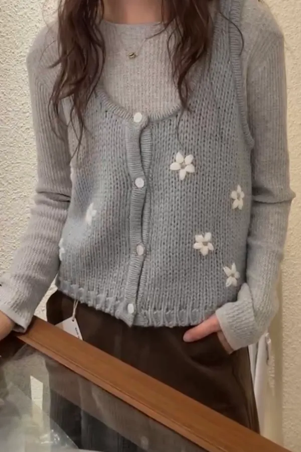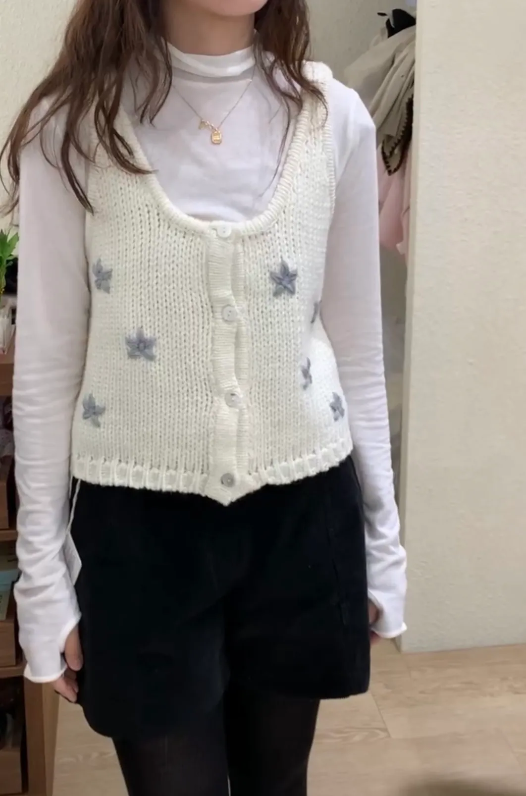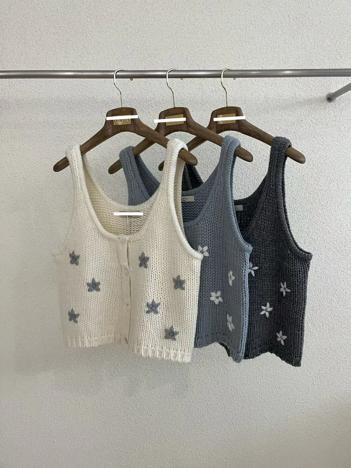 A57 1124高檔可愛家小花花排釦大U領羊毛20%針織背心