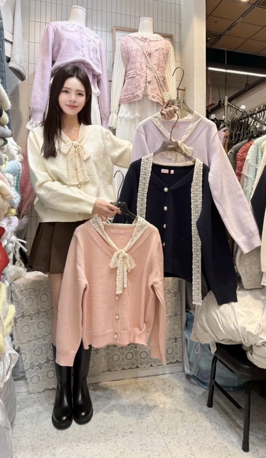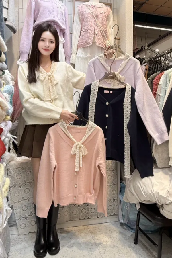 A100 1125甜美家布蕾絲蝴蝶結領巾排釦V領上衣4色